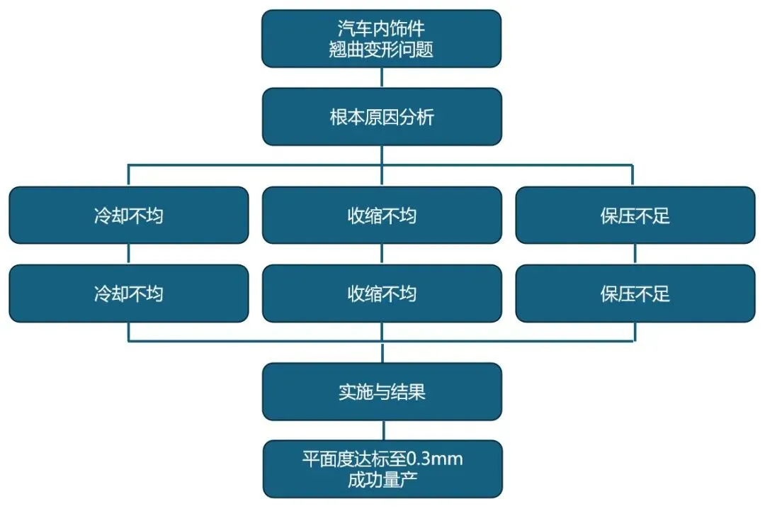 - 问题:T1试模后,产品发生严重翘曲变形,无法与门板贴合,平面度超差0.8mm(要求≤0.5mm)。