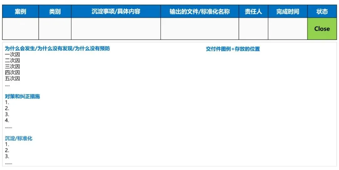 项目的总结沉淀和项目lesson learnt 是项目管理的重要一环,一般采用5Why法或人机料法环法进行总结沉定。重点是针对问题进行总结,问题描述、原因分析、短期对策和长期对策,总结出哪些是属于项目层面执行规范(SOP等)、哪些是属于部门层面的标准及规范、哪些是属于公司层面的流程或标准。对于下一个项目是否可以复用也要进行评估。