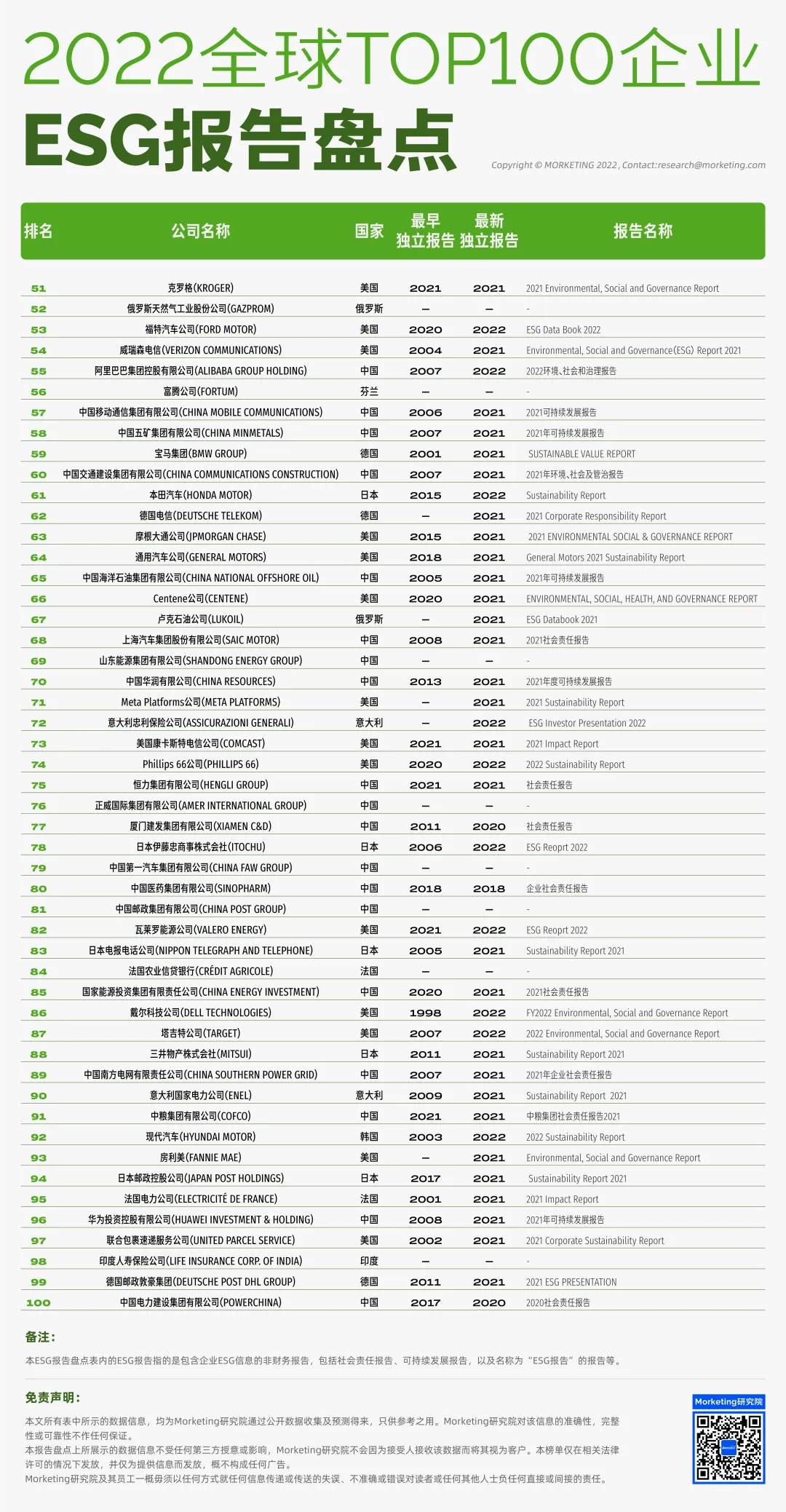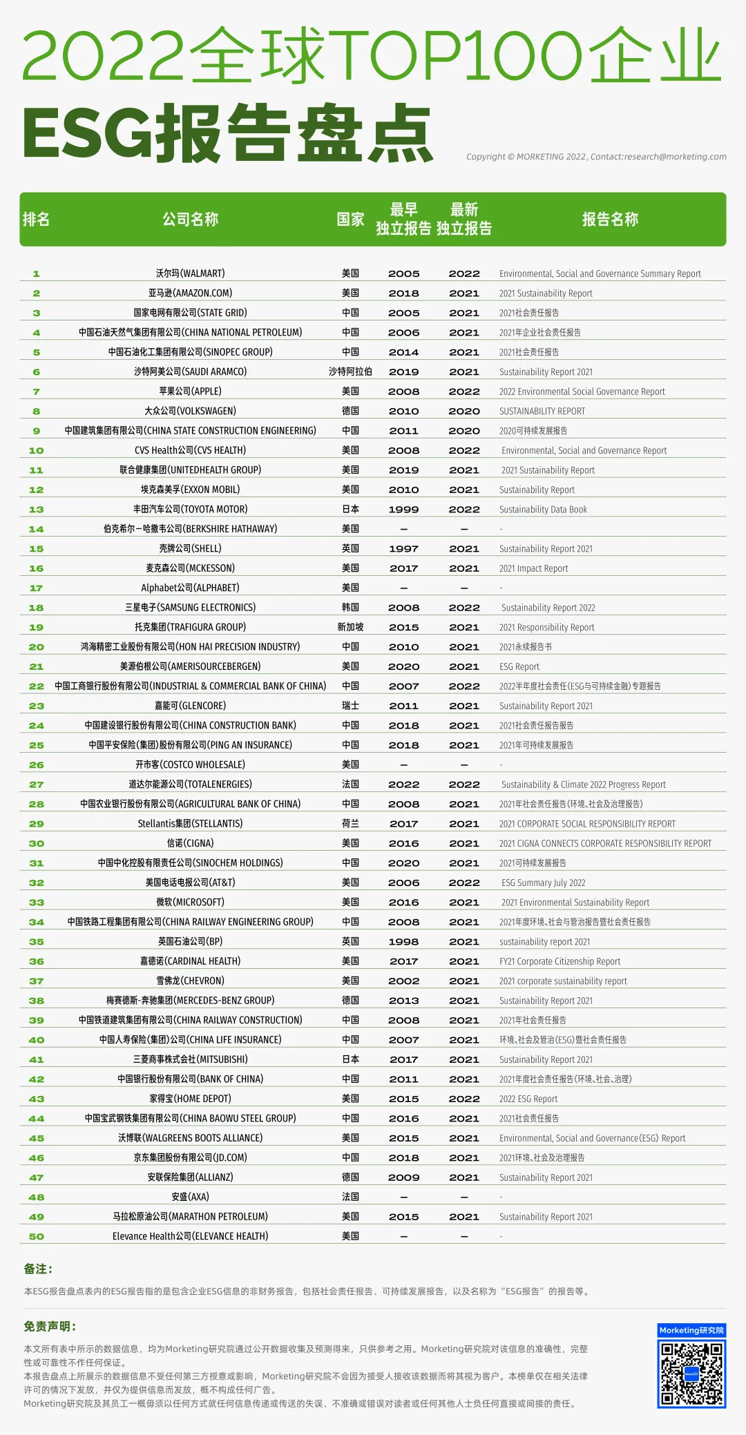 2022全球TOP100企业ESG报告盘点:97%在榜中国企业发布ESG相关