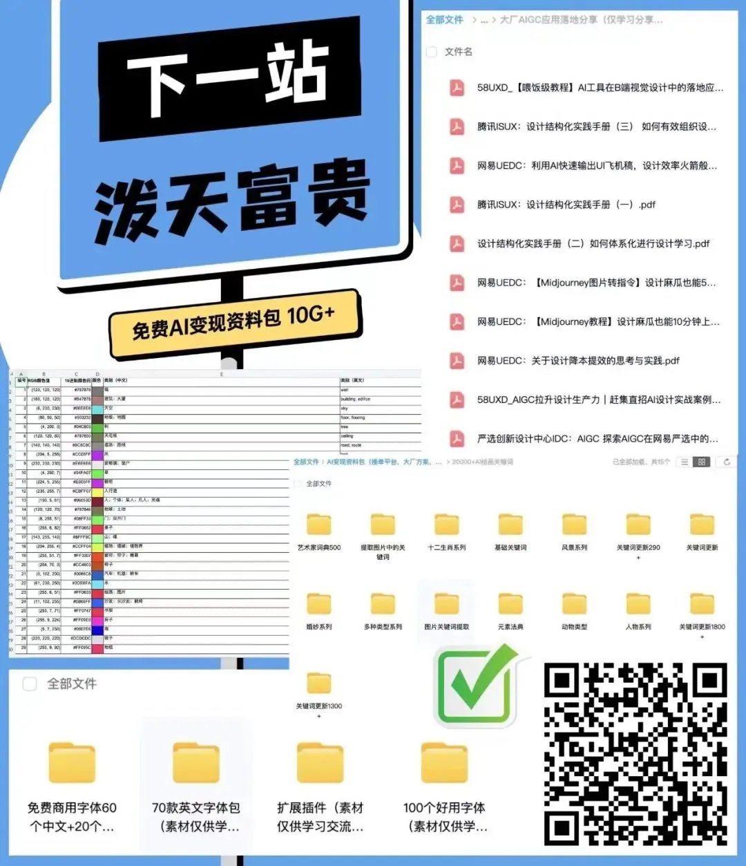 除以上内容,仔仔还为大家准备了10G+的免费AI变现资料包,资源还在持续更新中,长按下图扫码后,按步骤即可领取: