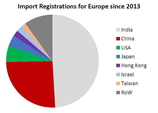 欧盟约80%的药品原料需要进口,从上图可以看到,欧盟市场中API进口注册数量,印度占了近半壁江山,中国是四分之一略高,与印度有较大的差距。