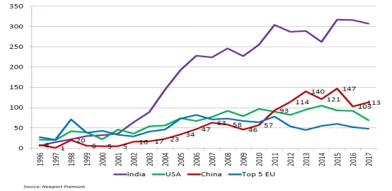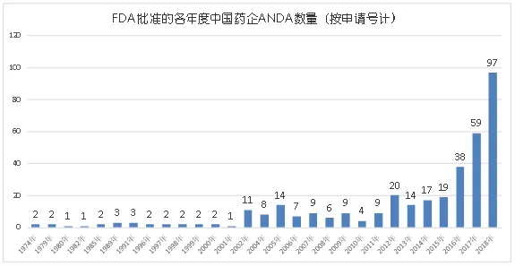 上图为在美国DMF注册的国别统计图,DMF注册表示这个原料有资质在美国销售,虽只代表品种数,但也可近似反映产量份额。可以看到在90年代,中印在美国进行DMF注册的数量相差不大,但在2000年后印度药企迅速崛起,积极在美国申请药品主文件(DMF)。早在2003年的时候,印度企业在美国申请DMF文件的数量占到了全世界总量的34%。