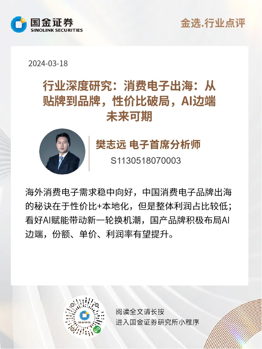 海外消费电子需求稳中向好,中国消费电子品牌出海的秘诀在于性价比+本地化,但是整体利润占比较低;看好AI赋能带动新一轮换机潮,国产品牌积极布局AI边端,份额、单价、利润率有望提升。建议积极关注小米集团、传音控股、安克创新、联想集团、雷神科技。