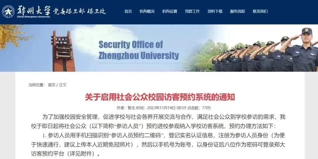在11月,郑州大学取消公众入校限制,通过访客预约系统,即可以个人名义申请入校,无需填写拜访单位、拜访人等信息。