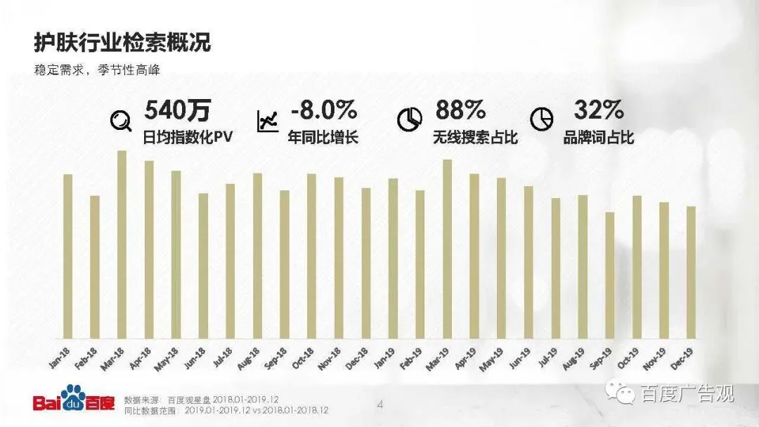百度每天响应540万词来自用户的关于护肤类的检索需求。其中近九成来自移动端,与品牌相关的检索占比为32%,通用词检索占比进一步加大。