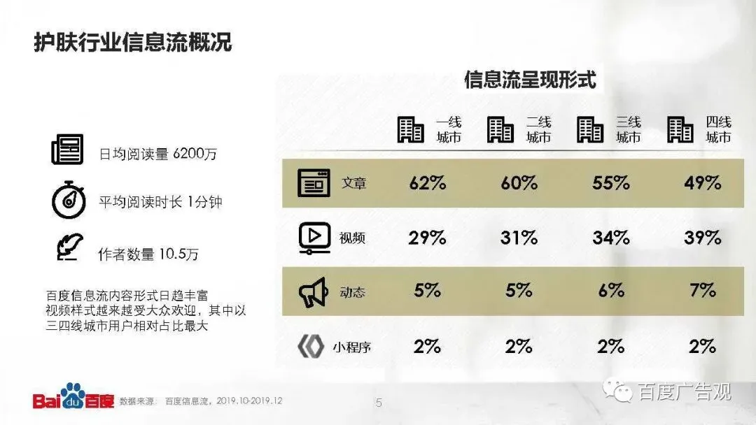 根据数据统计,在百度生产贡献护肤文章的作者数为10.5万,而用户在百度信息流的护肤文章日均阅读量高达6200万,平均阅读浏览时长为1分钟。在呈现形式上,文章占比最大,其次是视频、动态和小程序。值得关注的是视频样式越来越受大众欢迎,特别是生活节奏慢、闲暇时间多的三四线城市用户。