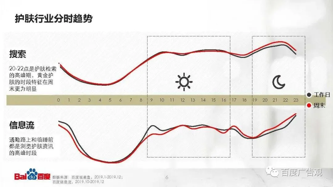 搜索的高峰时段集中在夜间20-22点,正是用户日常护肤的黄金时段,周末更为明显——检查肌肤状态,发现问题,寻找方案。