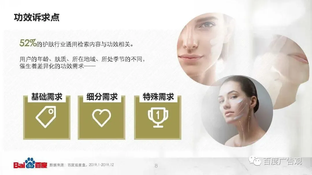 在所有的护肤通用检索中,有52%的检索量与功效相关。而消费者年龄、肤质、所在地域、所处季节的不同,催生着差异化的功效需求,根据他们的特点可以归为三大类: