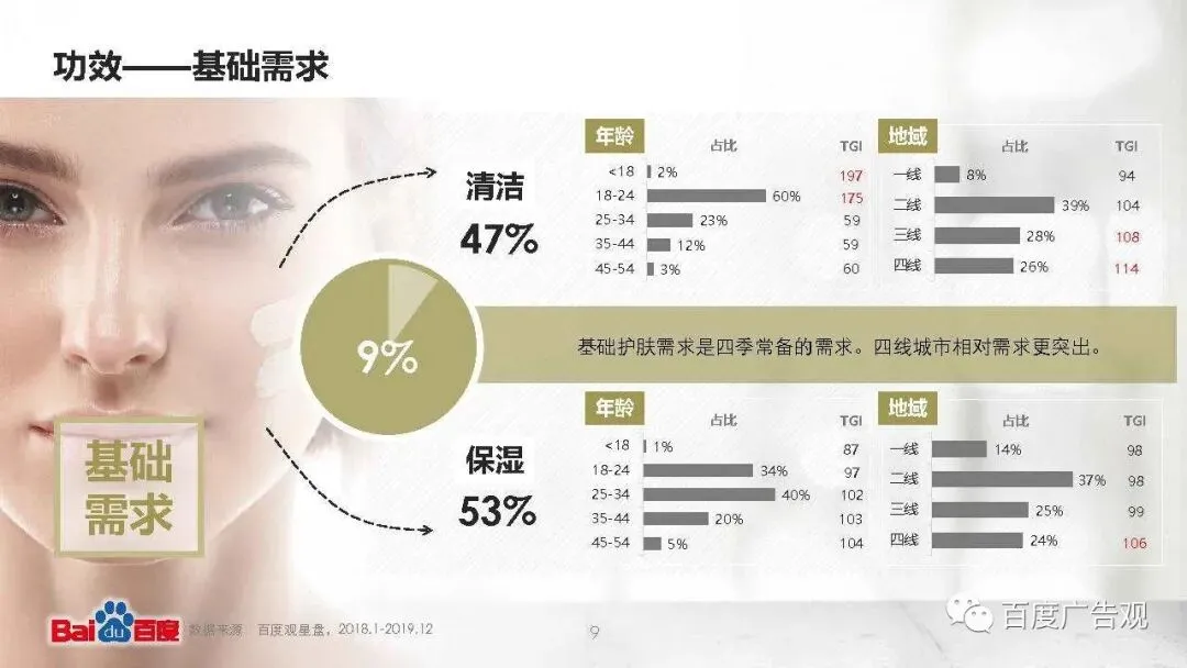 作为护肤入门,由清洁、保湿组成的基础需求占比9%。