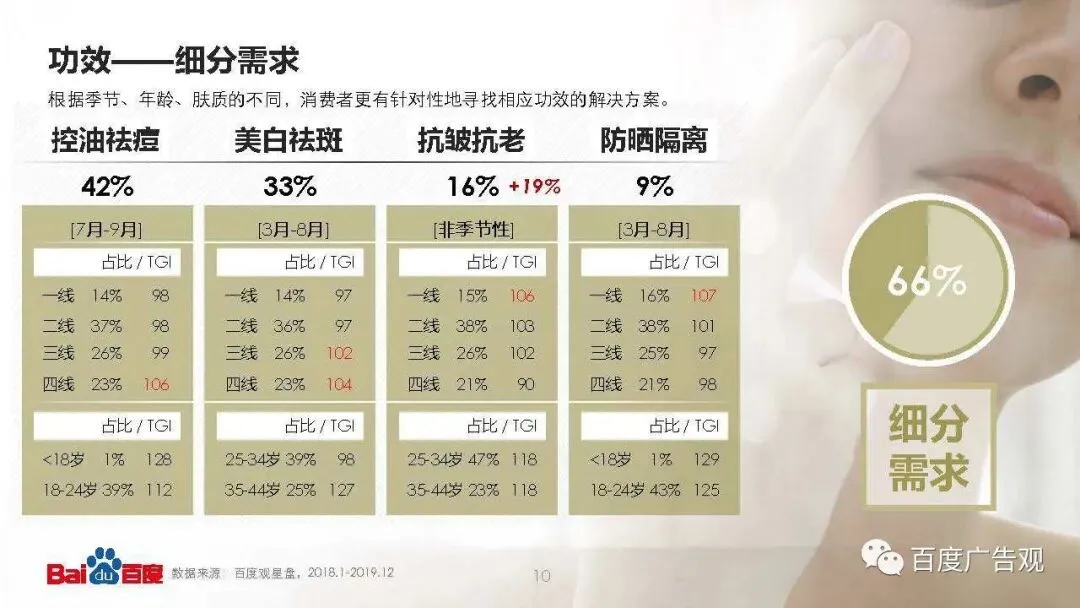 “人各有皮、肤各有时”,根据肤质、季节、年龄的差异,细分需求应运而生,搜索占比高达66%。