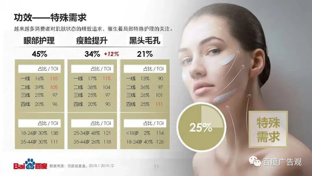 眼部护理、瘦脸提升、消除黑头毛孔这类特殊的局部护理诉求,已经占据了护肤功效总量的25%。