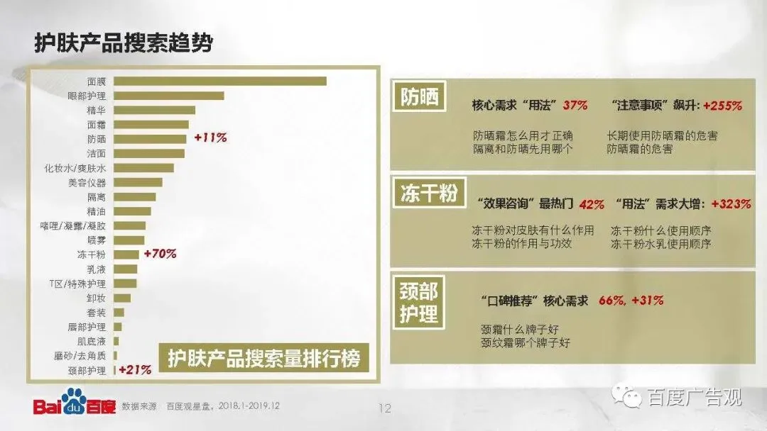 - 抗皱抗老的需求持续攀升,呈现19%的增长势头。25岁宛如一道分水岭,抵抗衰老加入了护肤日常KPI;