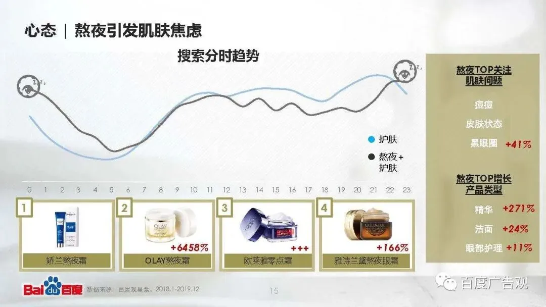 别人挤压你的白天,你只好挤压自己的黑夜,边报复性熬夜,边担心自己的肌肤状态,搜着“熬夜长痘痘怎么消除”、“熬夜对皮肤的危害”、“熬夜黑眼圈怎么消除”,寻求可以一抹活血的熬夜护肤产品。聪明的品牌瞄准用户这一恐慌焦虑,提出熬夜霜、熬夜眼霜的概念,以全新的细分品类身份打开市场。