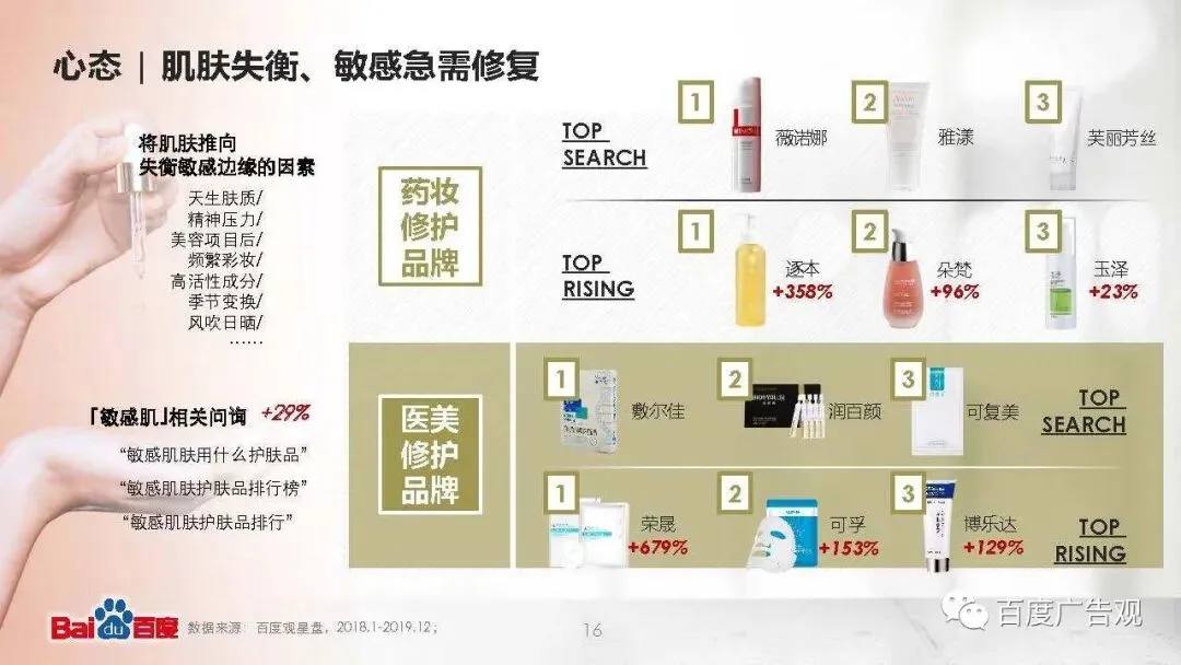 天生肤质、精神压力、医美项目后、频繁彩妆、高活性成分刺激、季节变换甚至风吹日晒都有可能将肌肤推向失衡敏感的边缘,而失衡的肌肤尤为脆弱,因此用户特别依赖口碑推荐,希望绕开雷区,避免再度刺激。