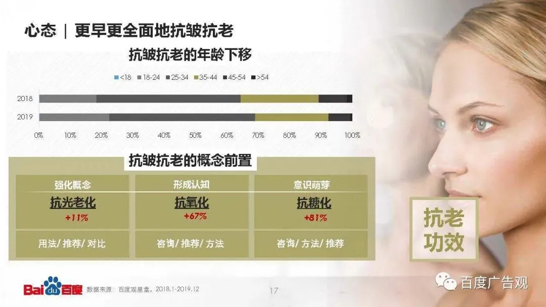 抗皱抗老的年龄下移:消费者对“抗老“的意识在进一步觉醒,分水岭线在往前推进,18-24岁的抗老需求从2018年的18%提高到2019年的22%。