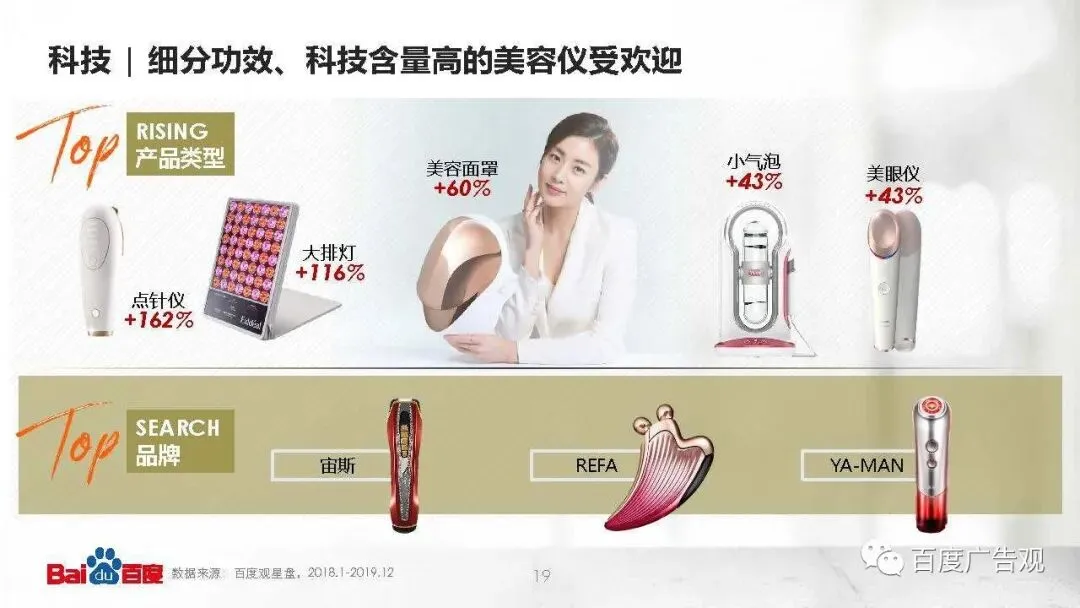 从后起之秀的点阵仪、大排灯、美容面罩、小气泡、美眼仪等产品可以看出,消费者对美容仪的期待功效从最初的清洁、蒸脸、按摩、导入导出等简单功能快速发展到淡化细纹、延缓衰老、美白淡斑等轻医美功能,因此目光逐渐转向细分功效更显著、科技含量更高的产品,大有把美容院搬到家里来的气势,疫情当下想必更是如此。
