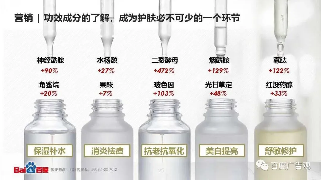功效成分的了解,成为护肤必不可少的一个环节。越来越多消费者从功效需求出发,了解对应的王牌或者新晋成分,进而选择相应的代表产品。如何深度构建品牌产品与明星成分之间的强关联是当下营销的一个重点。
