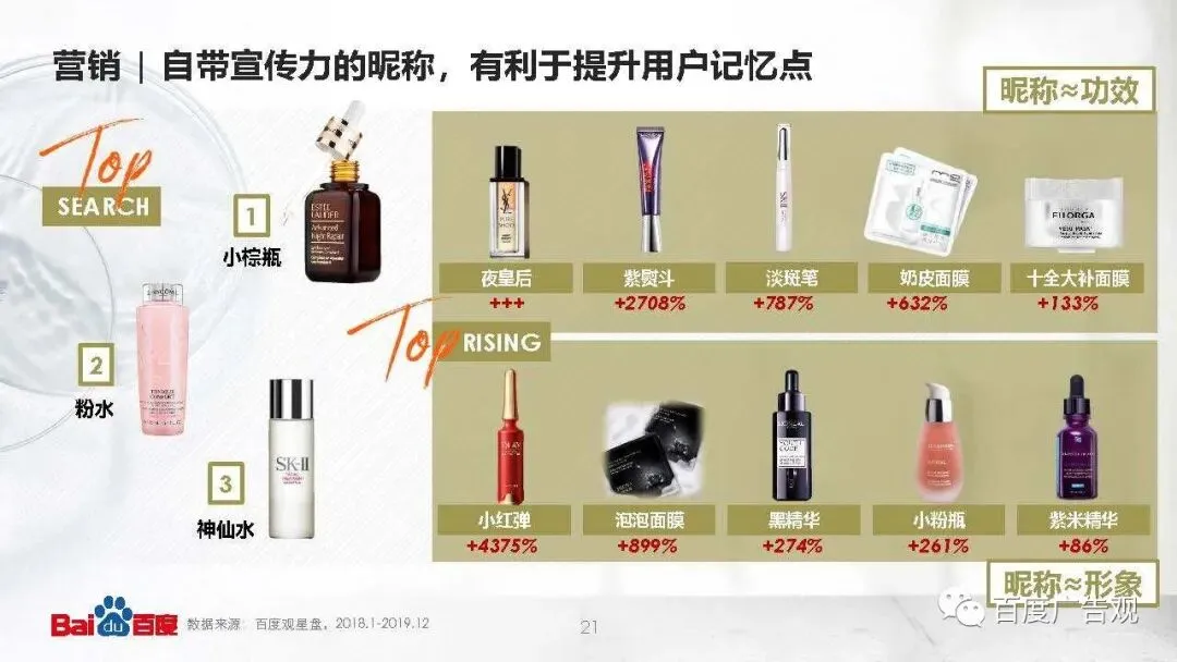 守住前三的产品昵称仍然是耳熟能详的:雅诗兰黛小棕瓶、兰蔻粉水、SK-II神仙水。