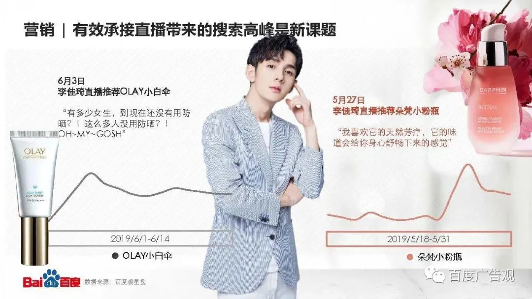 看了他直播的美眉们都会感慨“大家都用上5G了吗手速这么快”、“我之前怎么不知道这个产品这么好”、“这是什么新鲜玩意我要去查查”,所以我们发现李佳琦直播中推荐的产品,随后会在百度上出现检索高峰,品牌如何有效在百度上承接直播带来的搜索高峰是个新课题。