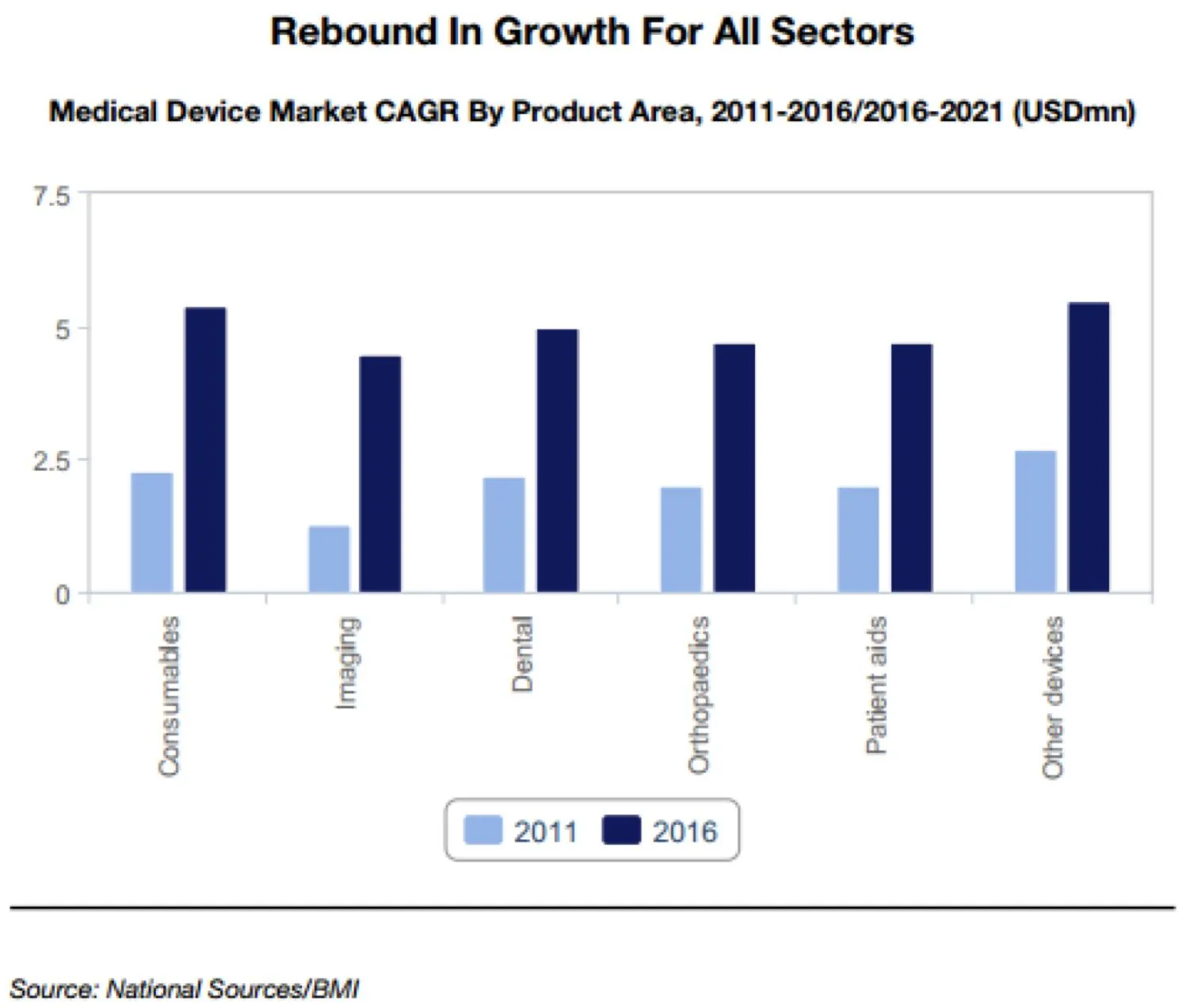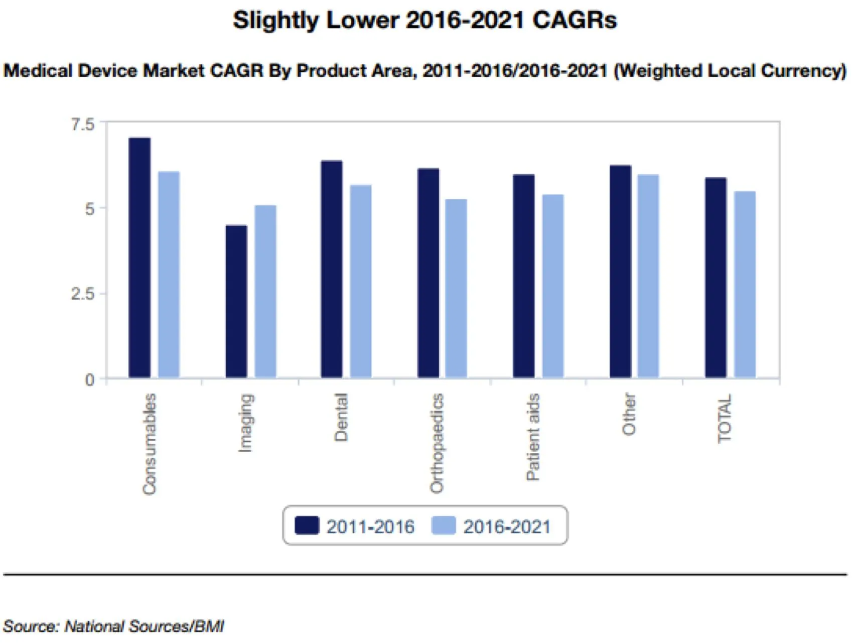 在商品的概念中,医用耗材包括绷带、纱布、注射器、缝合材料、医用手套、造瘘术产品以及其它医疗设备,在过去的5年里,该市场的最高CAGR达到6.1%-6.0%。在过去的5年里,牙科市场的最高CAGR达到5.7%,患者救护市场的的最高CAGR达到5.4%,矫形外科和修复市场的最高CAGR达到5.3%,影像诊断市场达到5.1%。