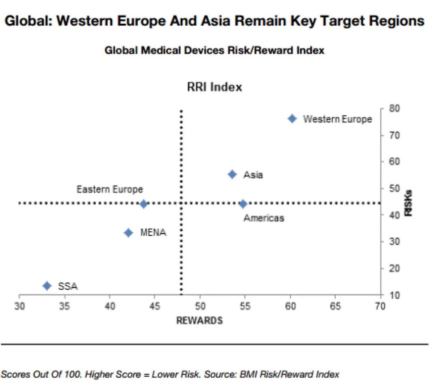 西欧地区有较完善的医疗体系和政策体系,所以其医疗器械市场是全球范围内最具吸引力的商业化医疗器械市场。亚洲拥有快速增长的医疗器械市场,美国医疗器械市场的发展高于平均水平,东欧地区由于政策、经济和经营风险,所以其医疗器械市场的发展低于平均水平。