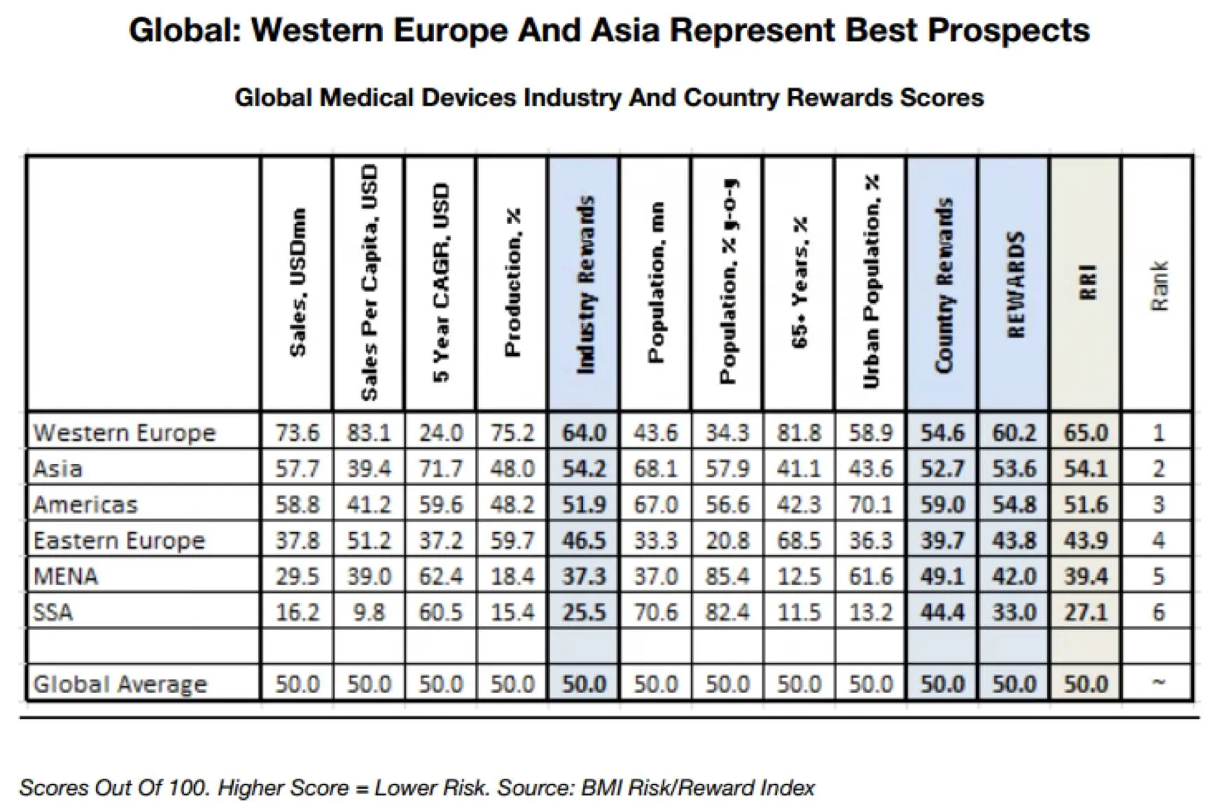 导语:国际评级机构惠誉(Fitch)旗下研究机构BMI Research在《Global Medical Devices Report Q2 2017》报告中表示,2016-2021年间全球医疗器械市场的CAGR为5.5%,其中西欧地区是全球范围内最具吸引力的商业化医疗器械市场,因为该地区有较完善的医疗体系和政策体系,亚洲拥有快速增长的医疗器械市场,美国医疗器械市场的发展高于平均水平,而东欧地区由于政策、经济和经营风险,其医疗器械市场的发展将低于平均水平。