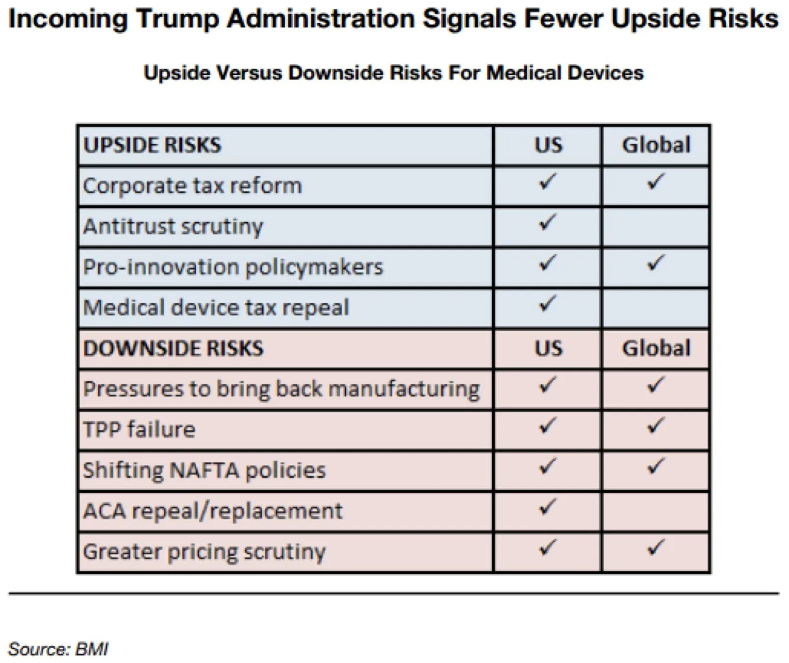 2017年1月20日,唐纳德·特朗普宣誓就任美国第45任总统,分析人士认为,特朗普上台令美国内政外交变量陡增,将给世界带来冲击。我们认为特朗普的上台将会对医疗器械行业带来一些影响。对美国市场而言,将面临4个上行风险和5个下行风险,对全球市场而言将面临2个上行风险和4个下行风险。