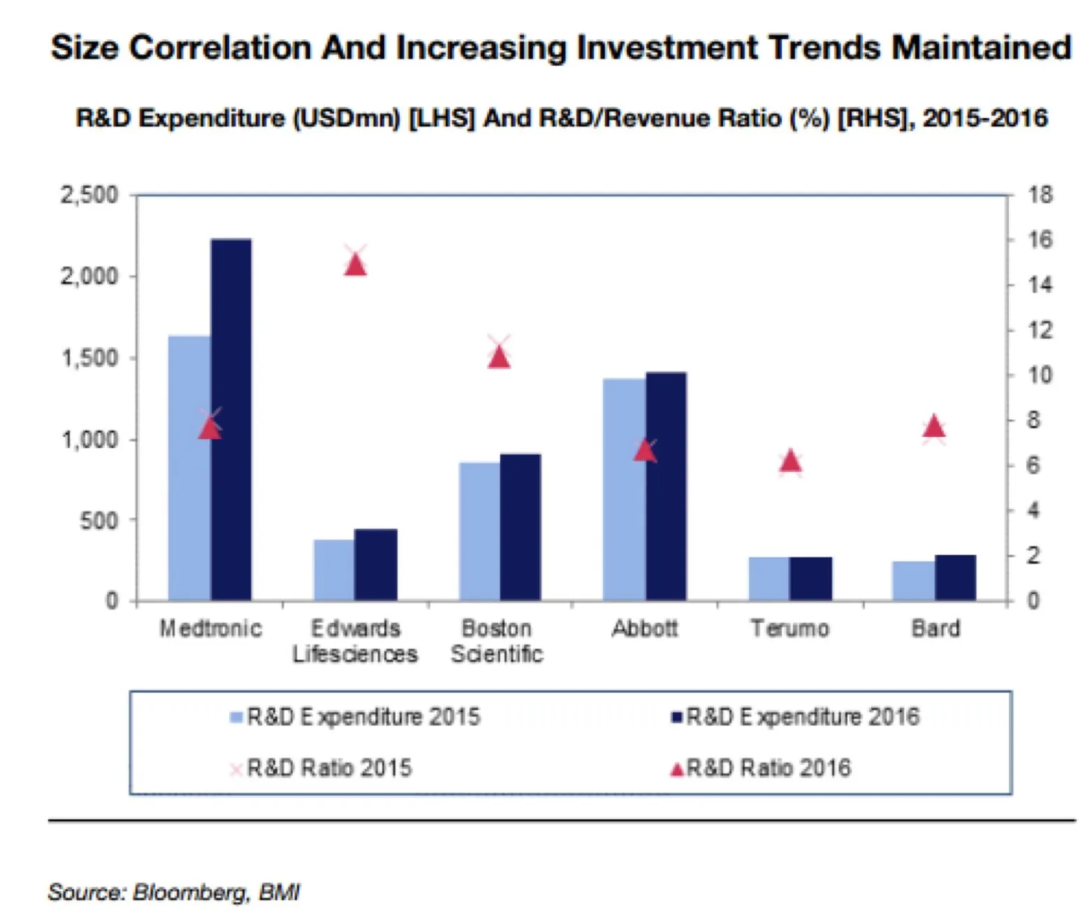 需要注意的是医疗器械行业的研发投入不能和制药行业相比,往往药物研发需要更多的研发投入。一个大型药企在2016年的平均研发投入占其营收的17.5%,而心血管器械公司的研发占比只有9.1%。