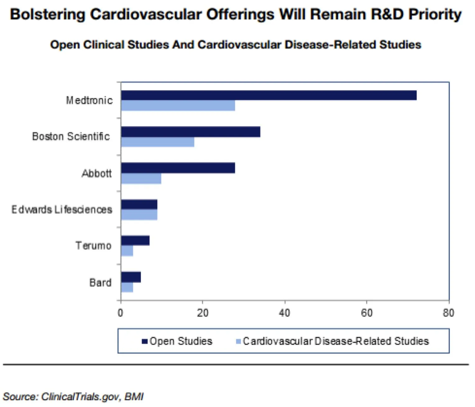 除了Edwards Lifesciences公司外,其它公司除了心血管领域的产品外,还在肿瘤、神经调节、糖尿病和泌尿科等领域也布局了相关产品。但是对所有公司来说,心血管领域的产品是公司收入中贡献最重要的部分,如对Abbott公司来说,血管方面的产品是其医疗器械板块中最大的分支。因此企业增加心血管医疗器械方面的研发投入能使企业不断发展并处于优势地位。目前心血管相关疾病的临床试验也在不断推进中,这些疾病包括主动脉瓣狭窄、二尖瓣反流、心力衰竭、心律失常、房颤、高血压和外周动脉疾病等。