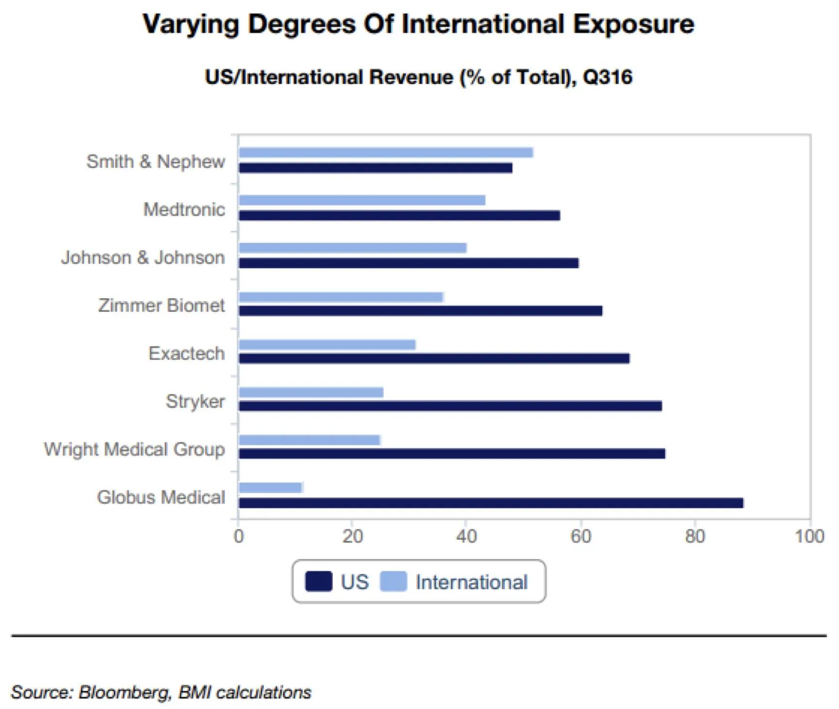 美元汇率的变动将影响拥有国际业务的美国骨科植入物制造商,此外,一些以美元作为报表货币的欧洲和亚洲公司,如Smith & Nephew (S&N)公司等,其价值也会受到汇率波动的影响。大型的骨科植入物公司或多或少受到美元汇率的影响,根据我们的分析,在2016年Q3,S&N公司受到的影响最大,因为S&N公司的总部位于英国并十分关注新兴国家的市场业务,因此,其51.7%的收入来自美国以外的地区。而Globus Medical公司受到的影响最小,因为其11.2%的收入来自美国以外的地区,当然这也和其业务规模较小有关。我们希望2017年美元相对于大多数货币来说走软,这将有利于业务在美国以外地区的骨科公司。