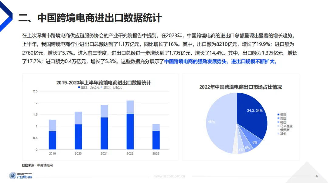 在上次深圳市跨境电商供应链服务协会的产业研究院报告中提到,在2023年,中国跨境电商的进出口总额呈现出显著的增长趋势。