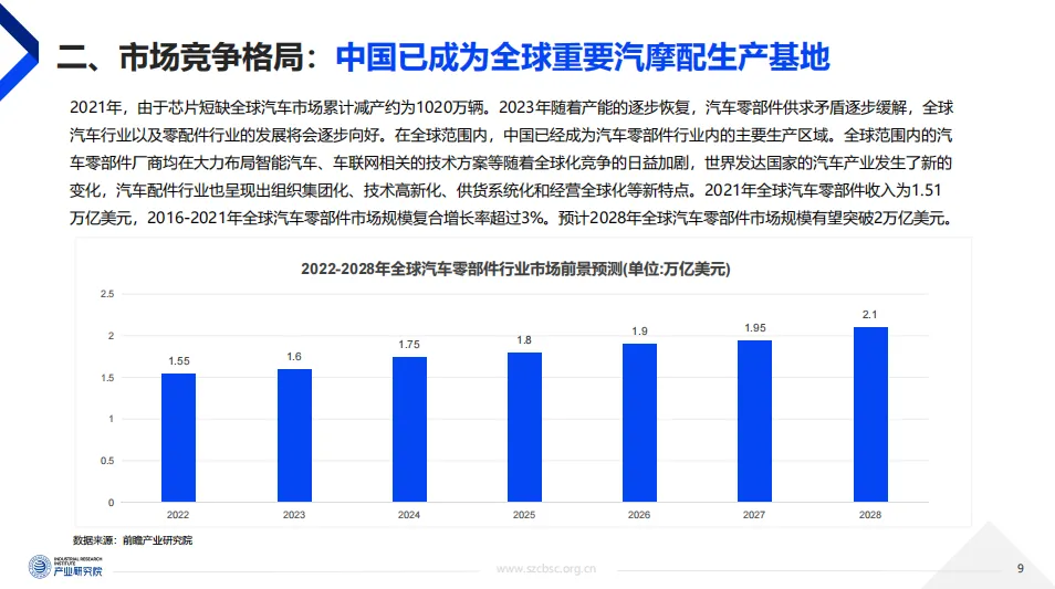 在全球范围内,中国已经成为汽车零部件行业内的主要生产区域。全球范围内的汽车零部件厂商均在大力布局智能汽车、车联网相关的技术方案等随着全球化竞争的日益加剧,世界发达国家的汽车产业发生了新的变化,汽车配件行业也呈现出组织集团化、技术高新化、供货系统化和经营全球化等新特点。2021年全球汽车零部件收入为1.51万亿美元,2016-2021年全球汽车零部件市场规模复合增长率超过3%。预计2028年全球汽车零部件市场规模有望突破2万亿美元。