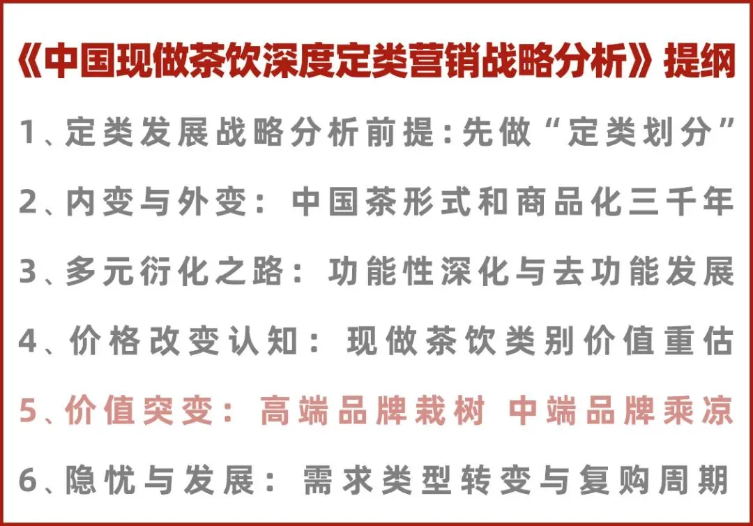 本文重点阐述《价值突变:高端品牌栽树 中端品牌乘凉 低端品牌好风光》,正是由于消费者对类别价值认知的突变,使得整个现做茶饮类别走出了负面认知、人群限制、价格限制的泥潭,才能开始飞速发展。价值突变受益的是类别内部所有的品牌,无论定价高低,全部受益。