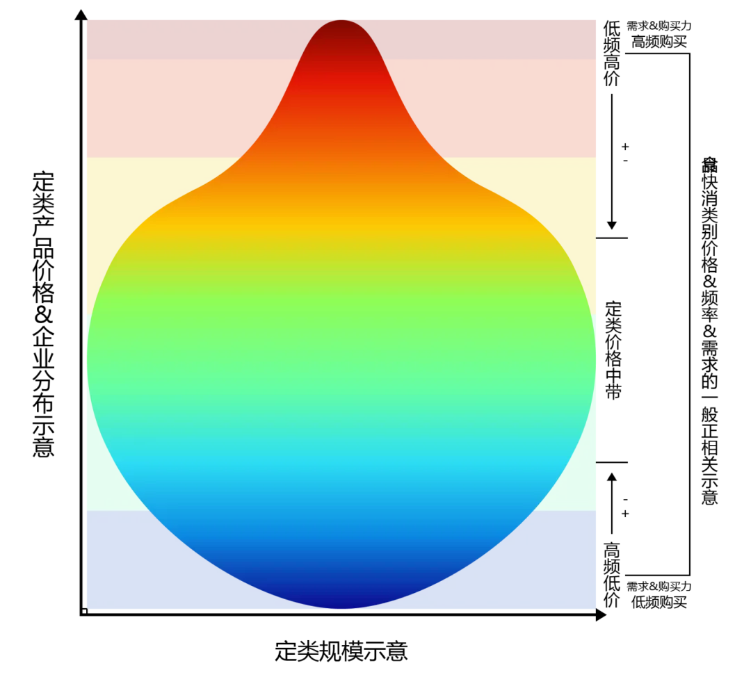 在消费分层的商品化社会,品牌的分布必然会以高中低3档价格划分体系为分层基础,进行阶层化发展。我这里有一张图,是一幅定类原创的分析类别价格分布排序的图谱,大家可以把现做茶饮类别的不同品牌望着个梨型图里面放,基本上就是一幅完整的类别定价分布图。