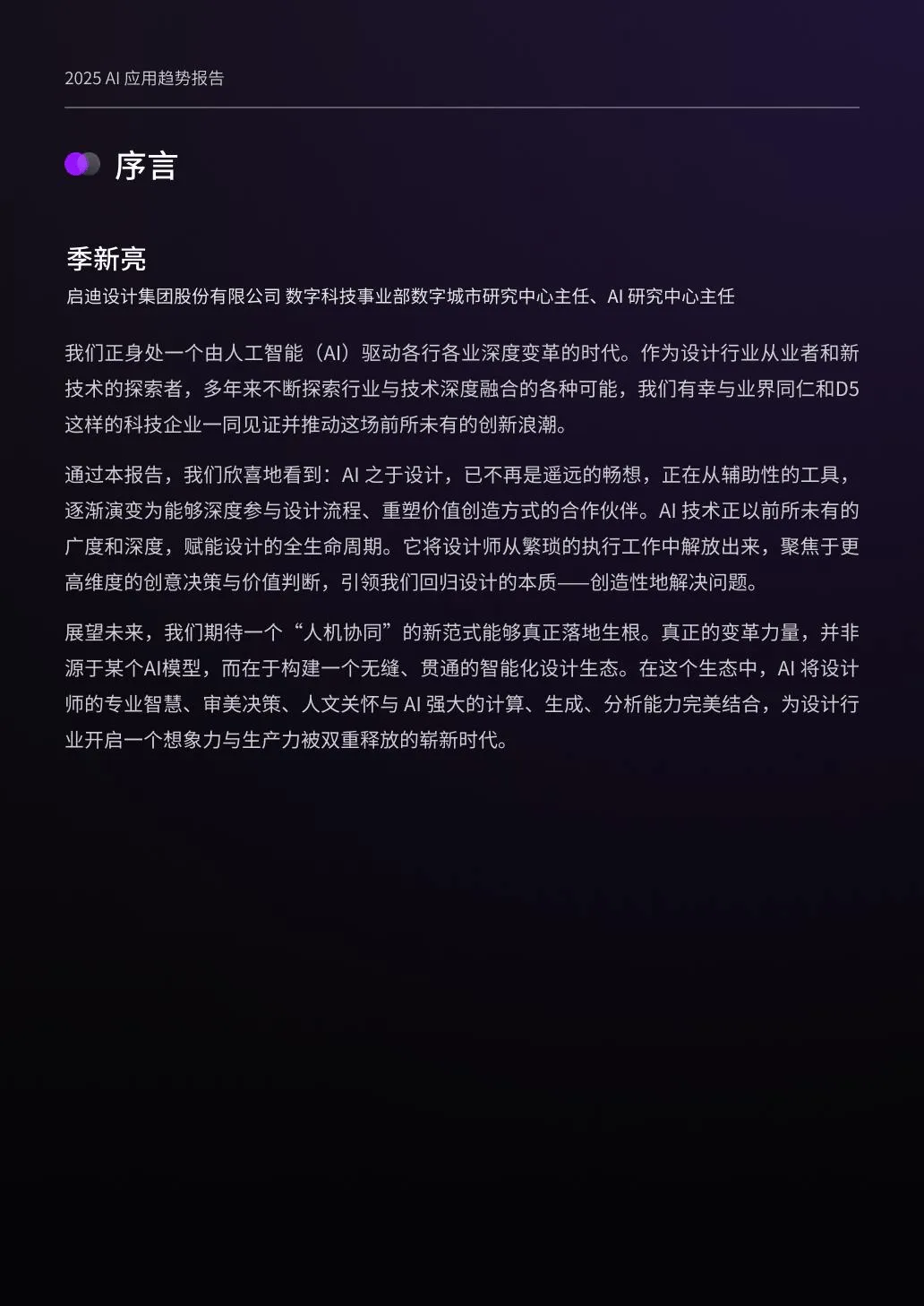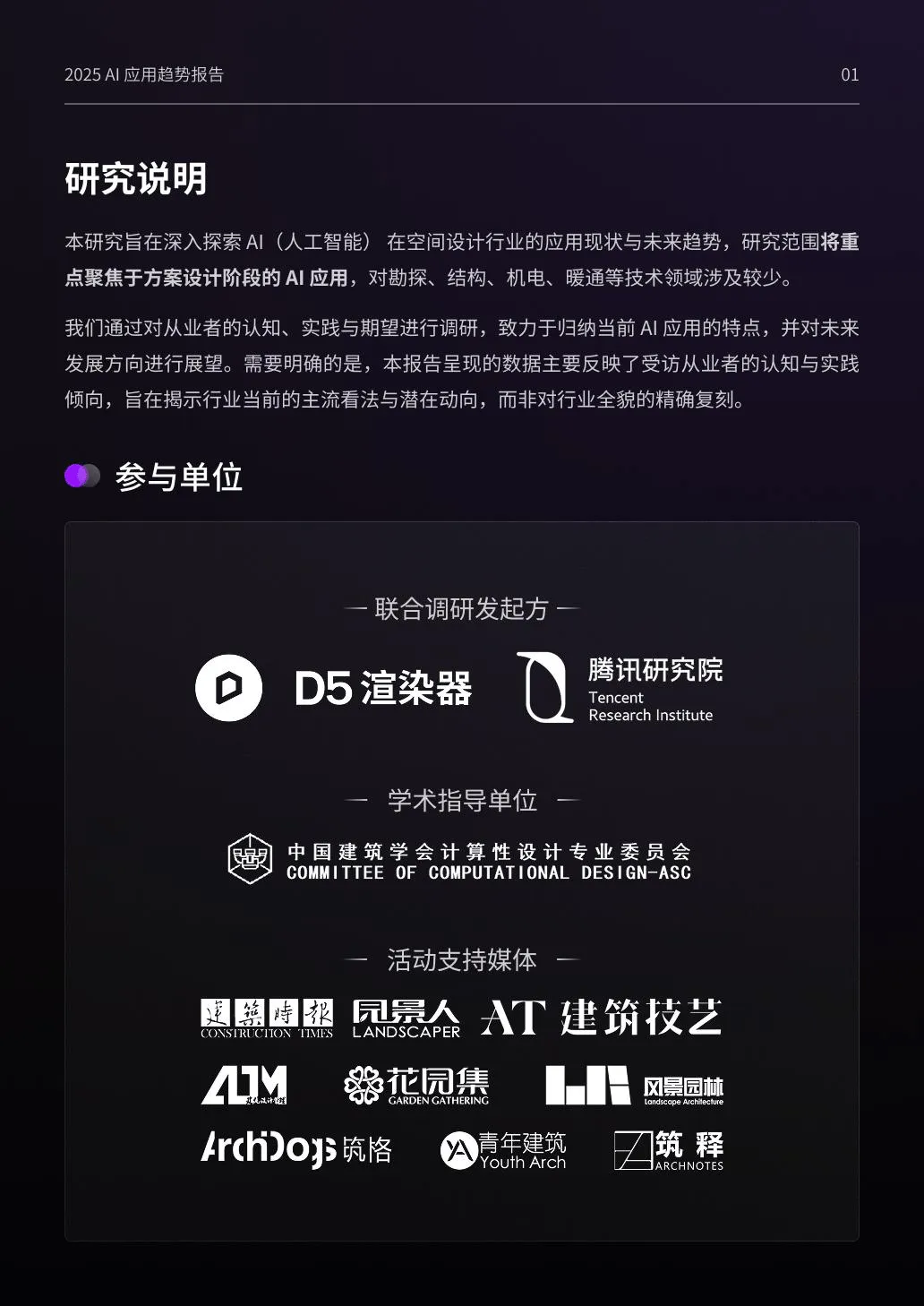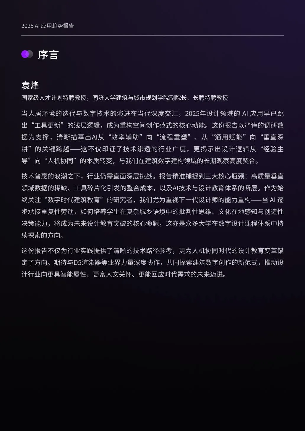 《2025设计行业AI应用趋势报告》由D5渲染器与腾讯研究院联合发布,通过对2490份有效样本的调研及深度访谈,系统呈现了AI在设计行业的应用现状、趋势与挑战。报告显示,AI已从工具更新演进为重构设计范式的核心动能,实现从效率辅助到流程重塑、从通用赋能到垂直深耕的关键跨越。