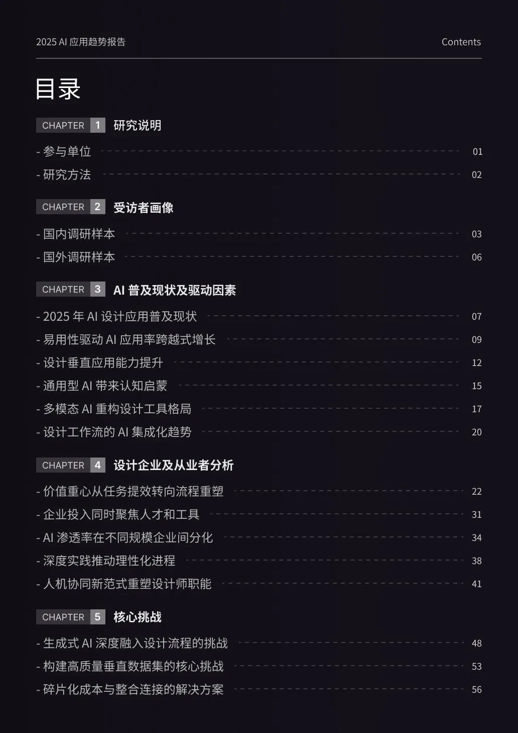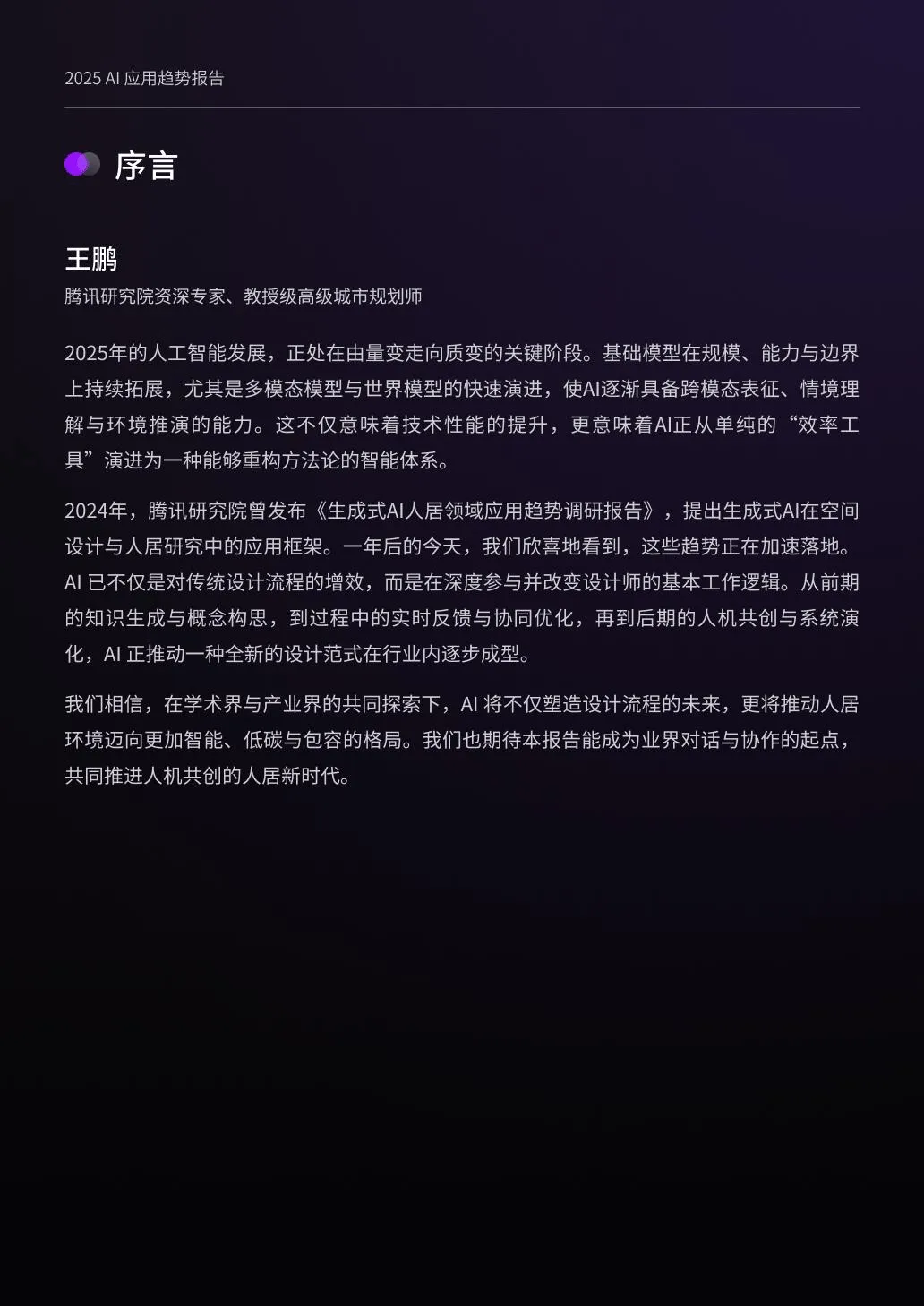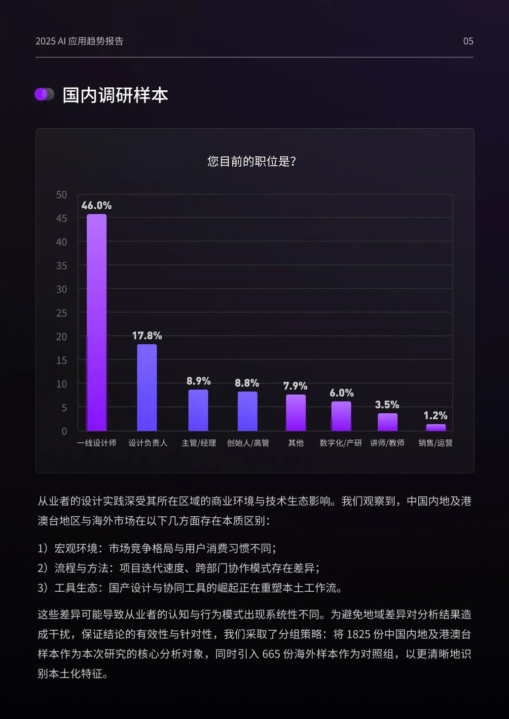 《2025设计行业AI应用趋势报告》由D5渲染器与腾讯研究院联合发布,通过对2490份有效样本的调研及深度访谈,系统呈现了AI在设计行业的应用现状、趋势与挑战。报告显示,AI已从工具更新演进为重构设计范式的核心动能,实现从效率辅助到流程重塑、从通用赋能到垂直深耕的关键跨越。