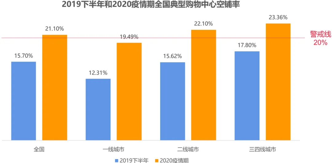 行业公认的空铺率警戒线为20%,疫情期间,全国典型购物中心平均空置率(空铺面积/总铺位面积)为21.10%,超过警戒线。