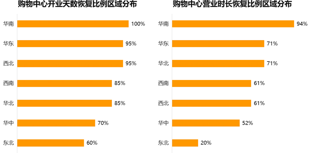 从区域开业营业情况来看,二季度情况明显好转。其中,华南地区样本购物中心恢复情况相较良好,但华中、东北地区样本购物中心处境仍然艰难。