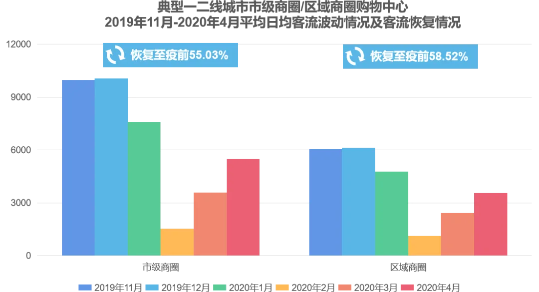 从4月客流情况看,全国一二三四线城市购物中心的客流恢复约66%,但受疫情期间顾客场内停留时长缩短及消费频次降低影响,消费增长仅恢复到疫前50%左右。
