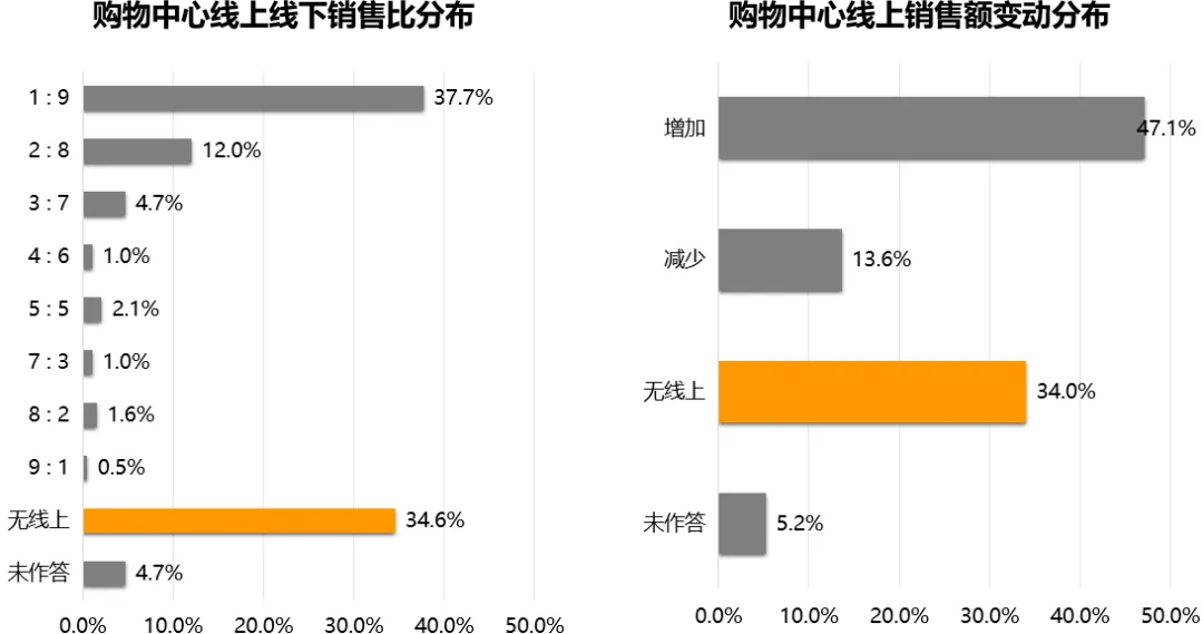 调研显示,疫情期间,样本购物中心无线上渠道的比例超过3成,而线上线下销售比1:9的比例接近4成。此外,即便拥有线上渠道,仅不到5成的购物中心线上销售额有所增加。疫情期间,绝大多数购物中心线上自救效果不佳,线上渠道未能有效发挥,其数字化水平远低于品牌商。