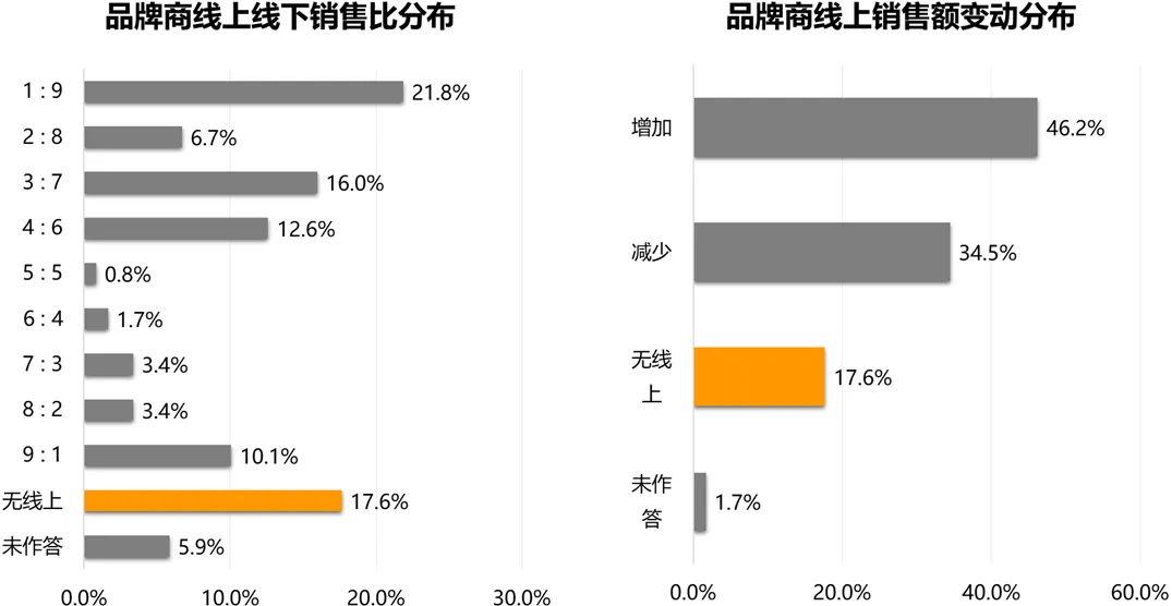 消费市场的数字化,根本上为品牌商的数字化提供了优良土壤。调研显示,虽然无线上渠道的连锁品牌商占比不到2成,但从整体来看,线上线下结合的效果不佳。