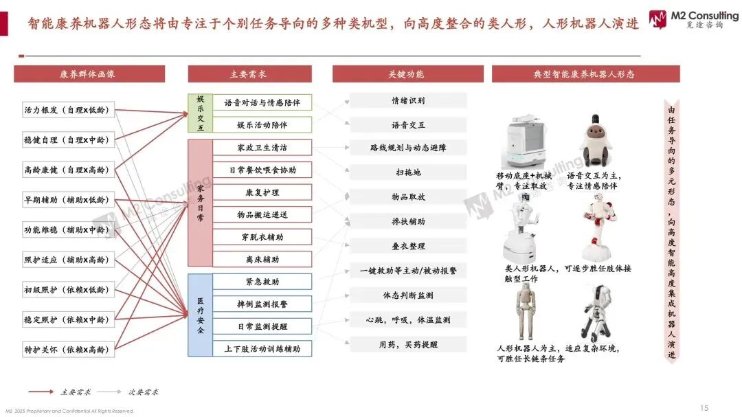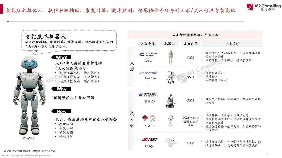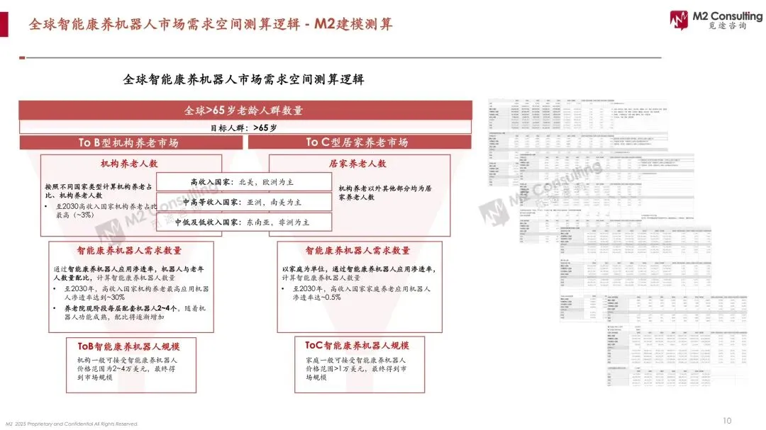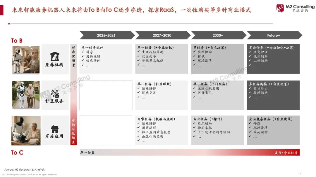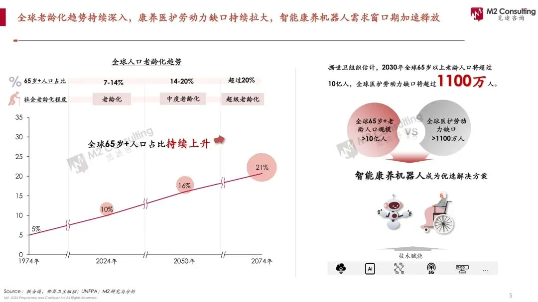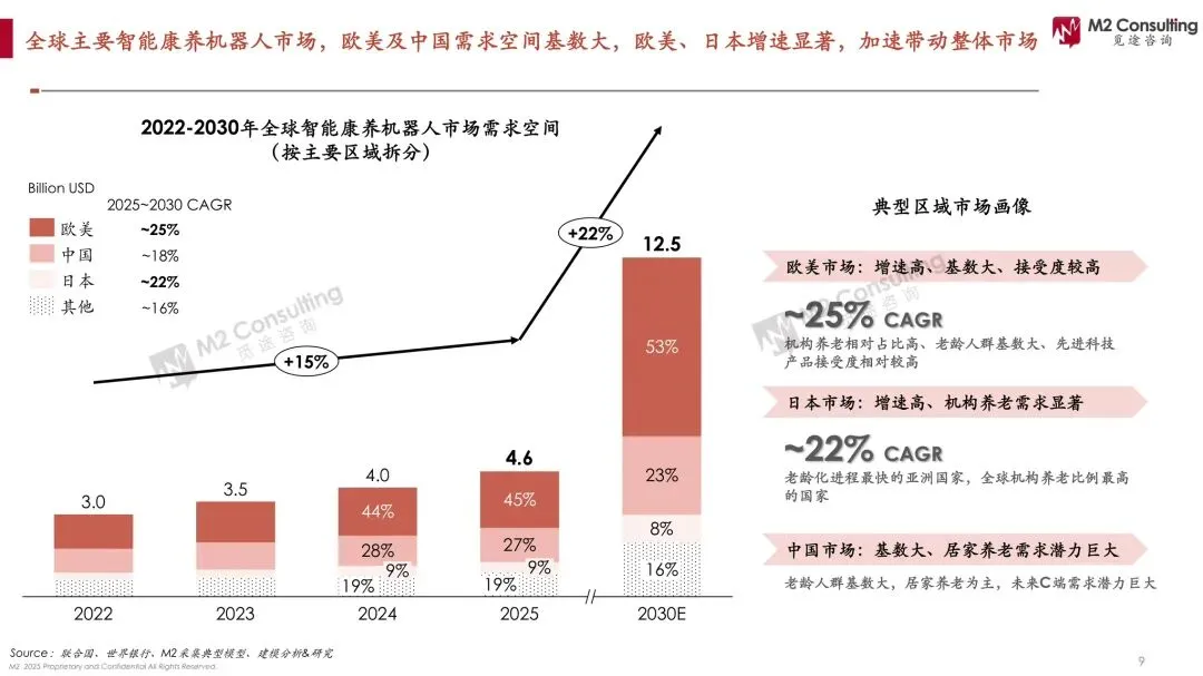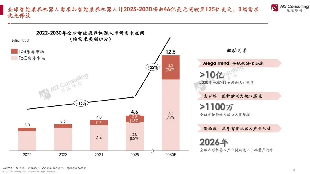 当全球医护缺口1100万遇上10亿银发海啸,康养机器人正从“噱头”升级为“续命刚需”。 M2白皮书测算,2025年全球智能康养市场46亿美元,2030年飙至125亿美元,年复合22%;其中ToB机构占比75%,日本机构养老机器人渗透率30%,中国居家场景渗透率仅0.5%。