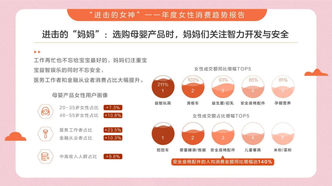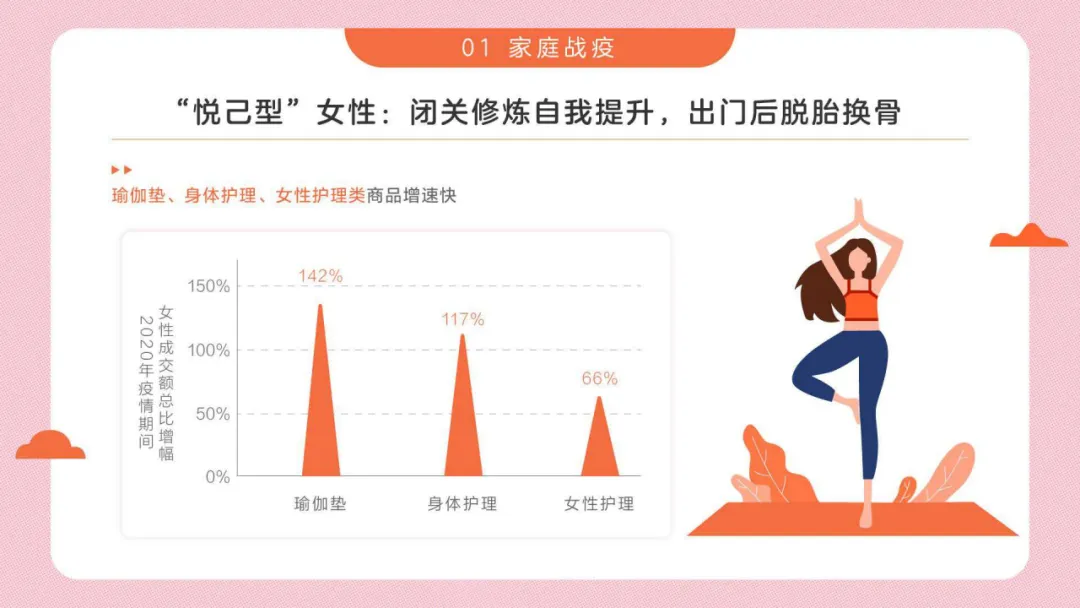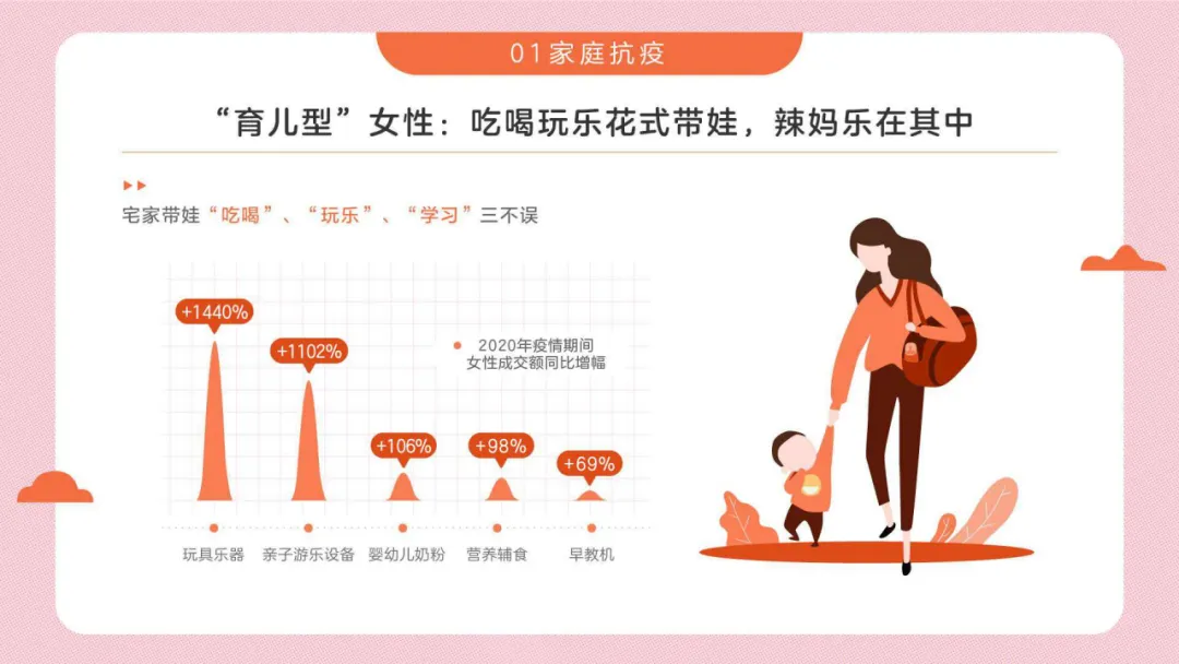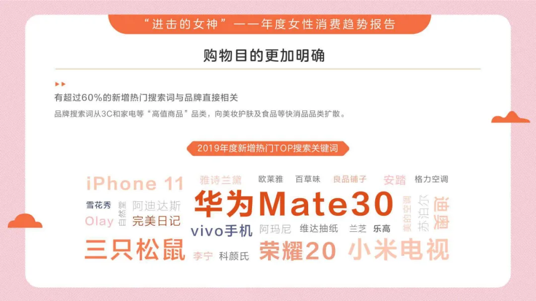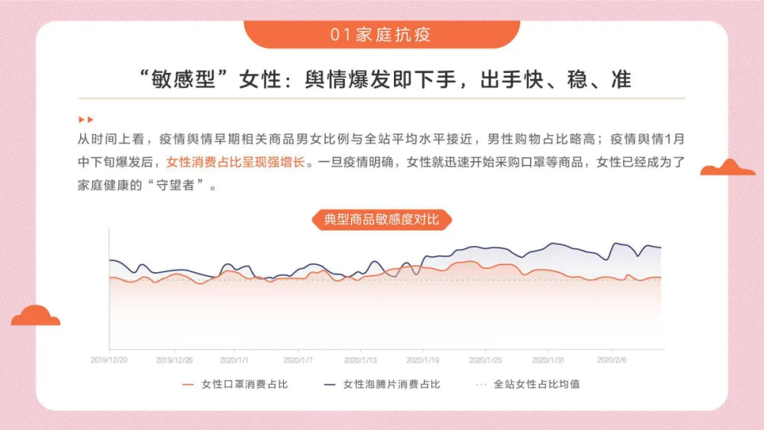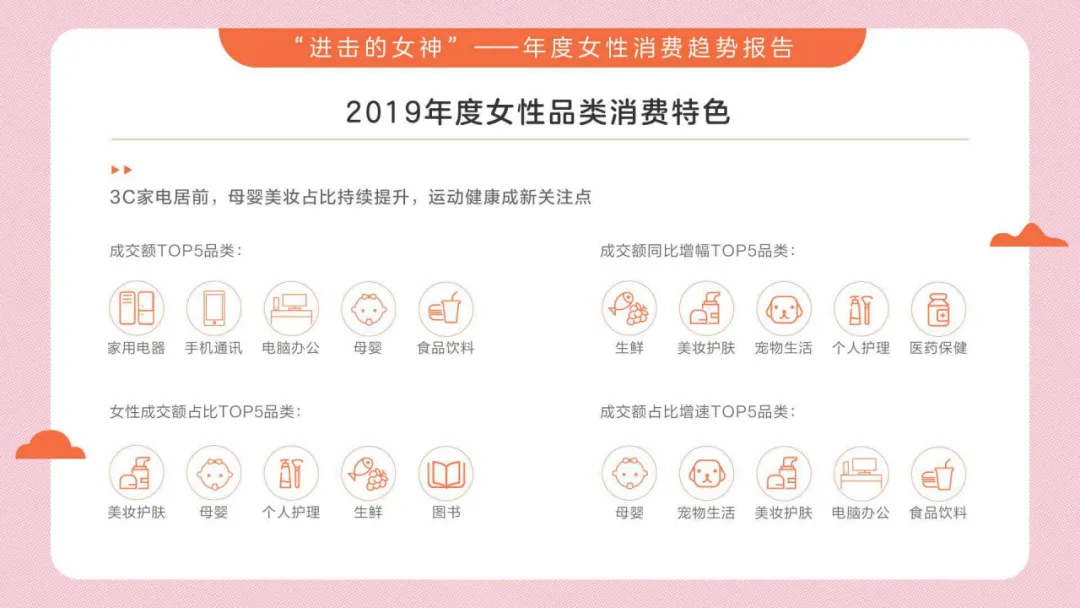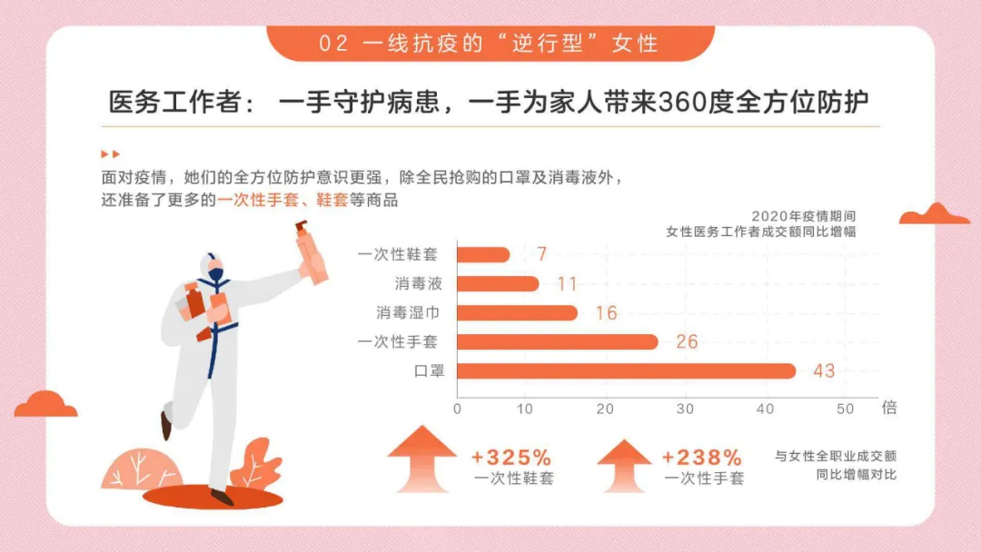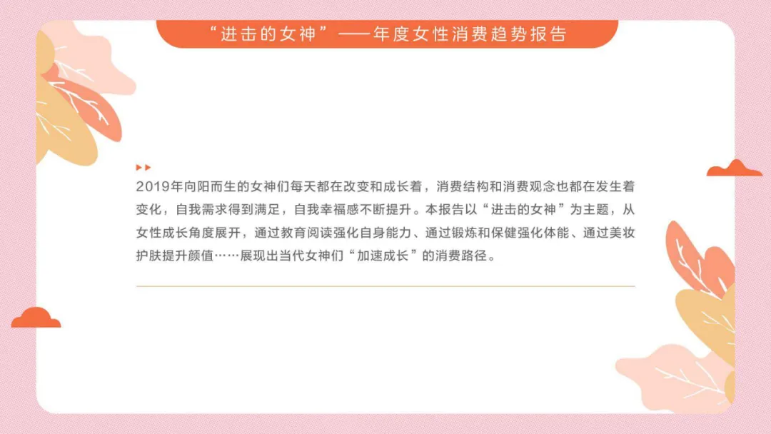 《报告》显示,2019年女神们消费了更多的3C和家电类商品,母婴和美妆类商品中女性消费占比保有量高且持续提升,运动健康也成为了她们新的关注点。女性2020年的最难忘和最值得买的购物清单中,口罩、消毒液必不可少。疫情暴发以来,接收到信息的女性第一反应即买买买,尤其是为家中的老人和小孩子准备充足的防护