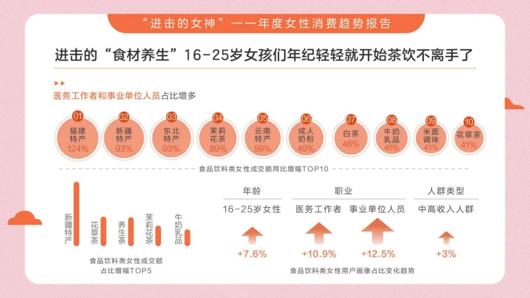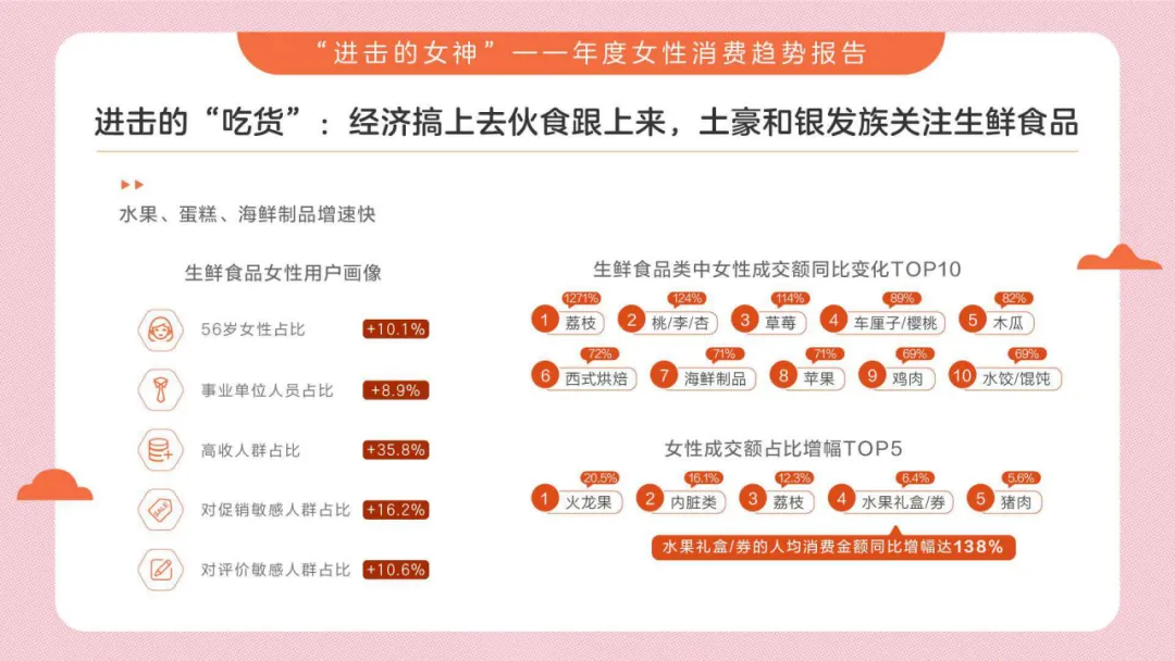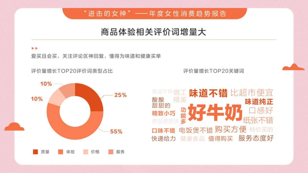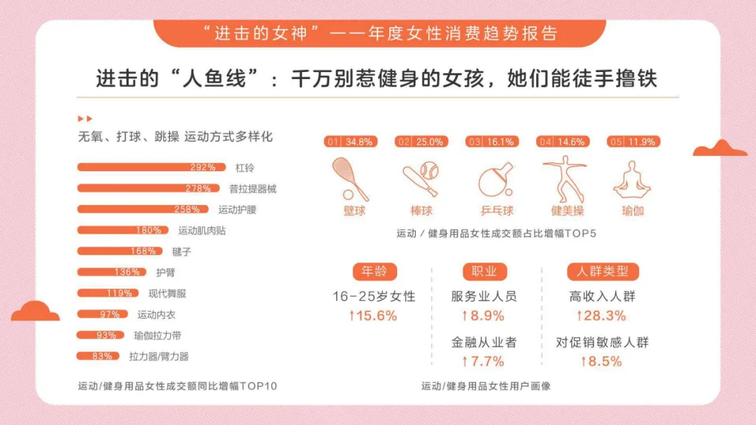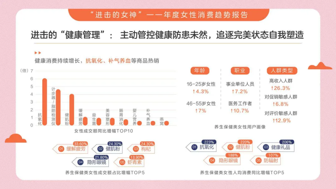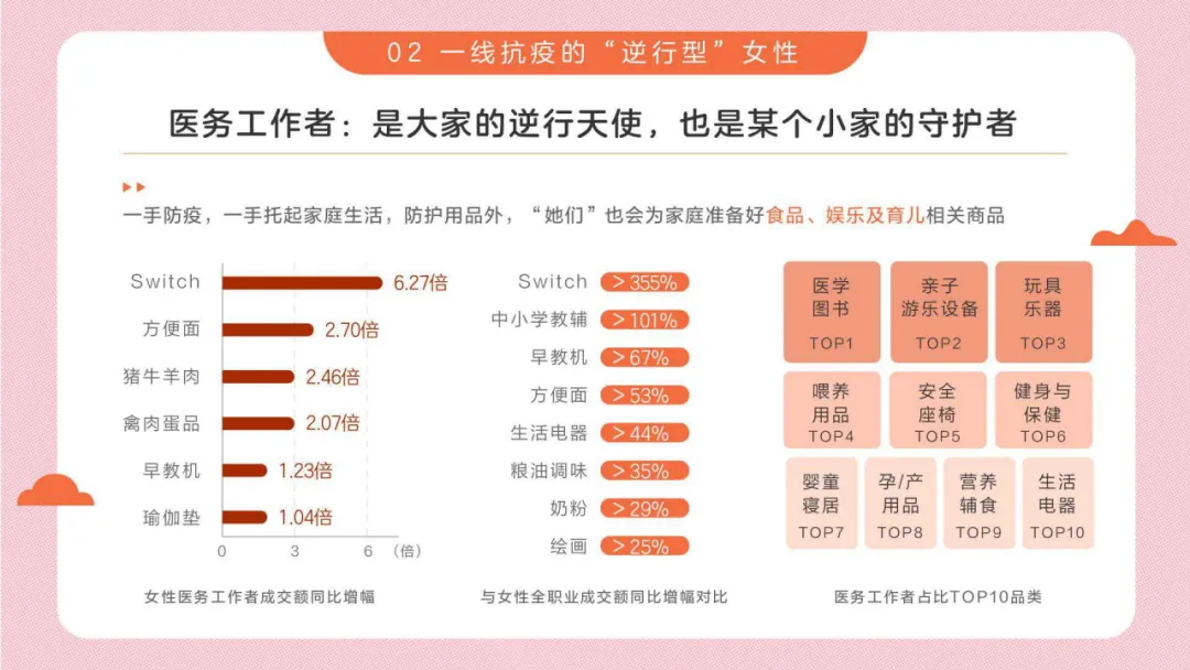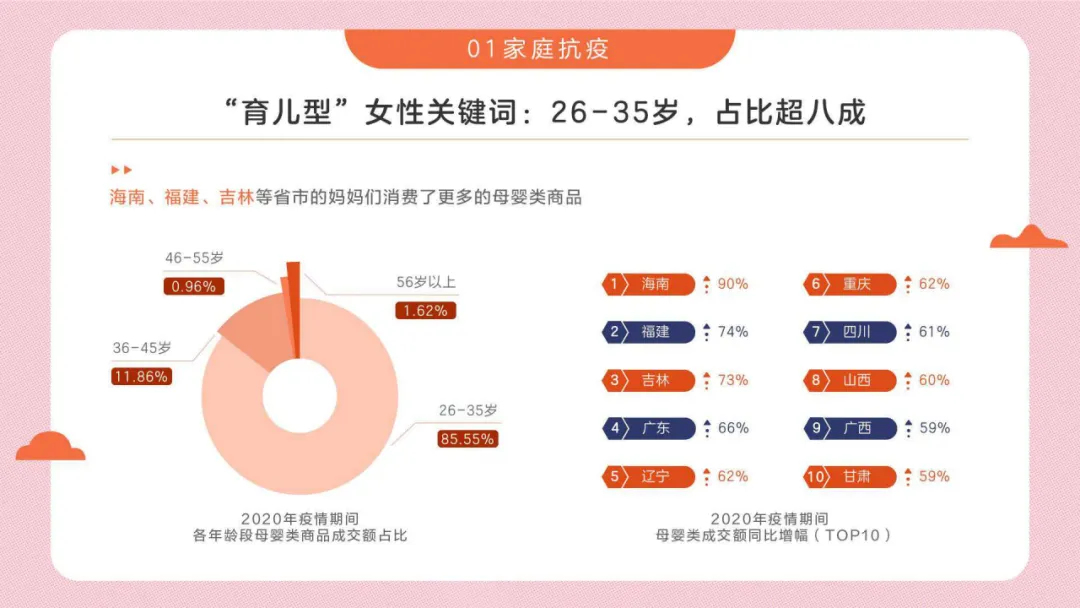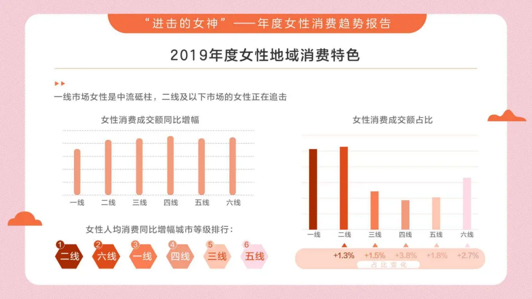 《报告》显示,2019年女神们消费了更多的3C和家电类商品,母婴和美妆类商品中女性消费占比保有量高且持续提升,运动健康也成为了她们新的关注点。女性2020年的最难忘和最值得买的购物清单中,口罩、消毒液必不可少。疫情暴发以来,接收到信息的女性第一反应即买买买,尤其是为家中的老人和小孩子准备充足的防护