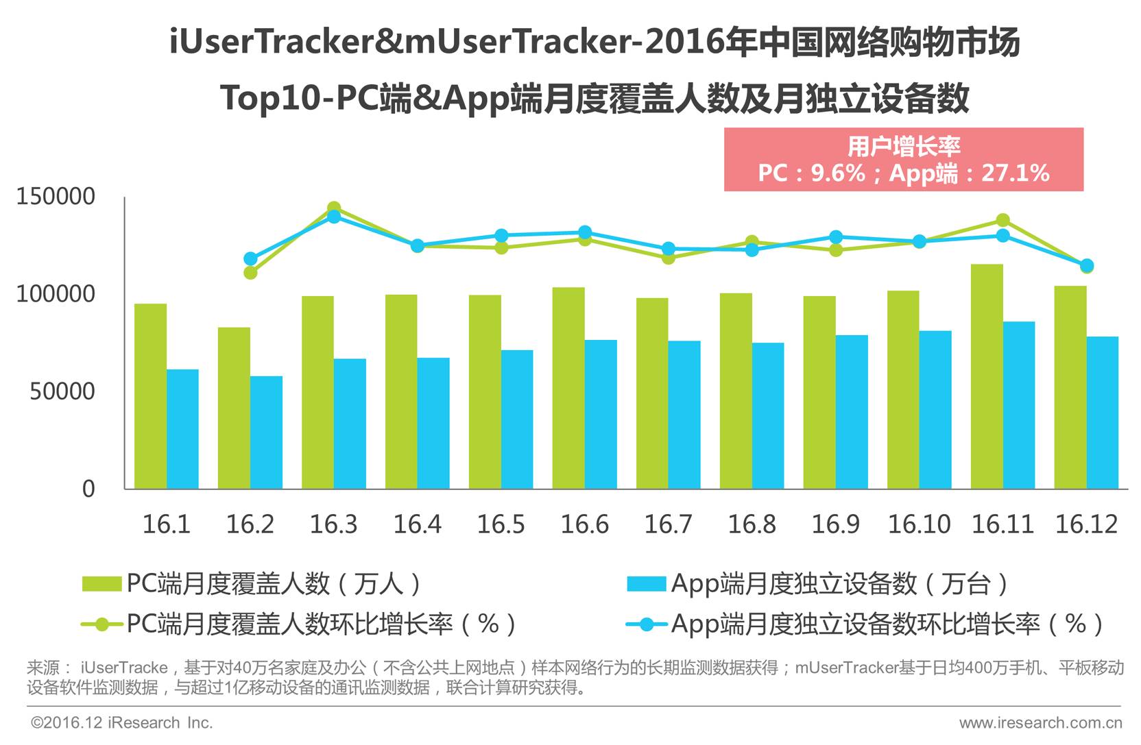 艾瑞咨询数据显示,2016年中国移动网购在整体网络购物交易规模中占比达到68.2%,比去年增长22.8个百分点,移动端已超过PC端成为网购市场更主要的消费场景;与此同时,2016年,中国网络购物市场TOP10企业移动端用户增速远超PC端,App端用户增速达27.1%,PC端仅增长9.6%。艾瑞分析认为,用户消费习惯的转移、各企业持续发力移动端是移动端不断渗透的主要原因。