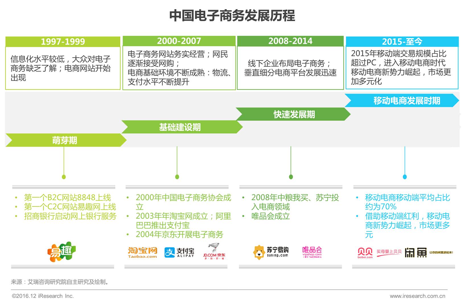 2013-2014年,随着移动互联网的发展和智能手机的普及,移动电商进入风口期,新一轮移动端网民红利带动许多新兴移动电商发展。2015年移动交易规模占比超过PC端标志移动电商时代正式到来。
