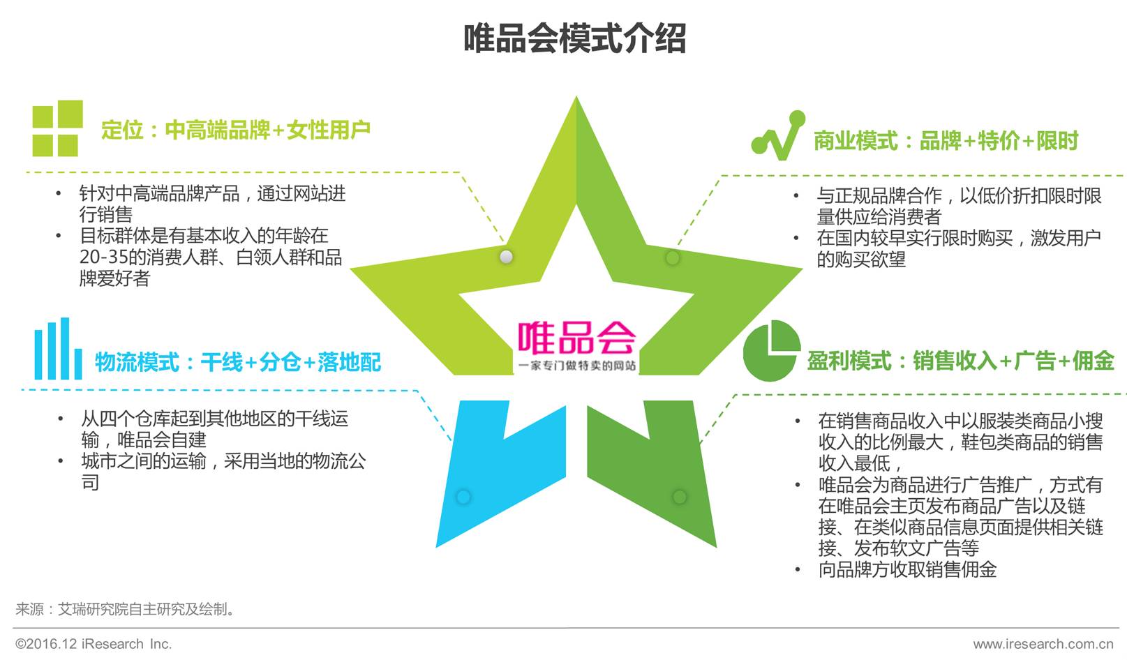 唯品会的限时特卖模式为其发展最大的特色。目前品类由服装向母婴、美妆类扩展,同时布局跨境业务,由垂直向综合领域发展,拥有优秀的买手团队和较强的营销、运营能力。