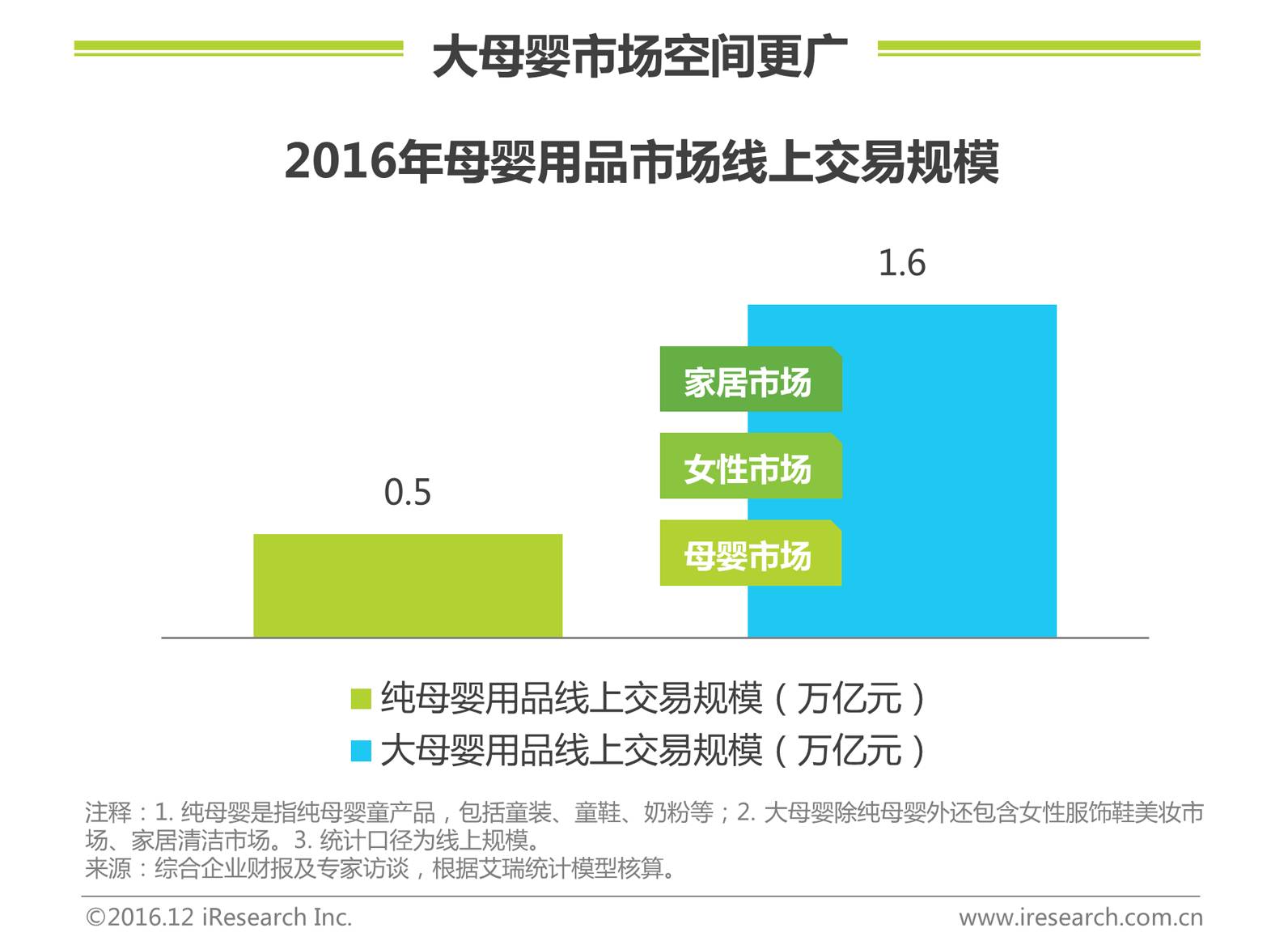 “妈妈经济”的核心观点就是每个妈妈背后都是一个家庭,整个“妈妈经济”将满足家庭消费所有需求,包括给小孩买东西、给自妈妈自己买东西,给家里买东西,围绕妈妈人群购买力进行的业务拓展成为“大母婴”市场新的经济助力增长点。2016年纯母婴用品线上交易规模为0.5万亿元,大母婴概念下市场交易规模为1.6万亿元,在整体妈妈经济中渗透率较低,仍有较大的发展空间。
