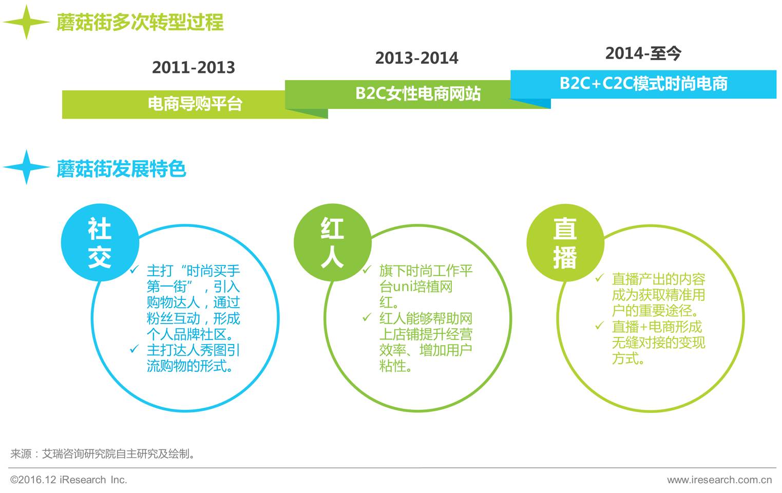 蘑菇街最早为电商导购平台,2013年下半年淘宝限制导购业务之后,转型为垂直电商。2016年蘑菇街与美丽说、淘世界合并,目前发展为集B2C和C2C模式为一身的女性时尚电商,社交、直播等新型营销方式成为发展特色。