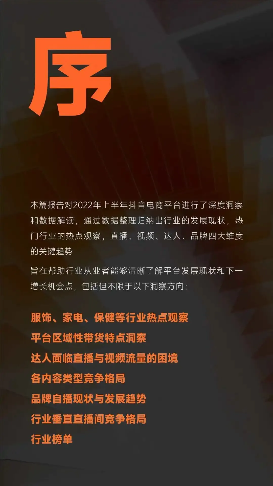本篇报告对2022年上半年抖音电商平台进行了深度洞察和数据解读,通过数据整理归纳出行业的发展现状,热门行业的热点观察,直播、视频、达人、品牌四大维度的关键趋势。